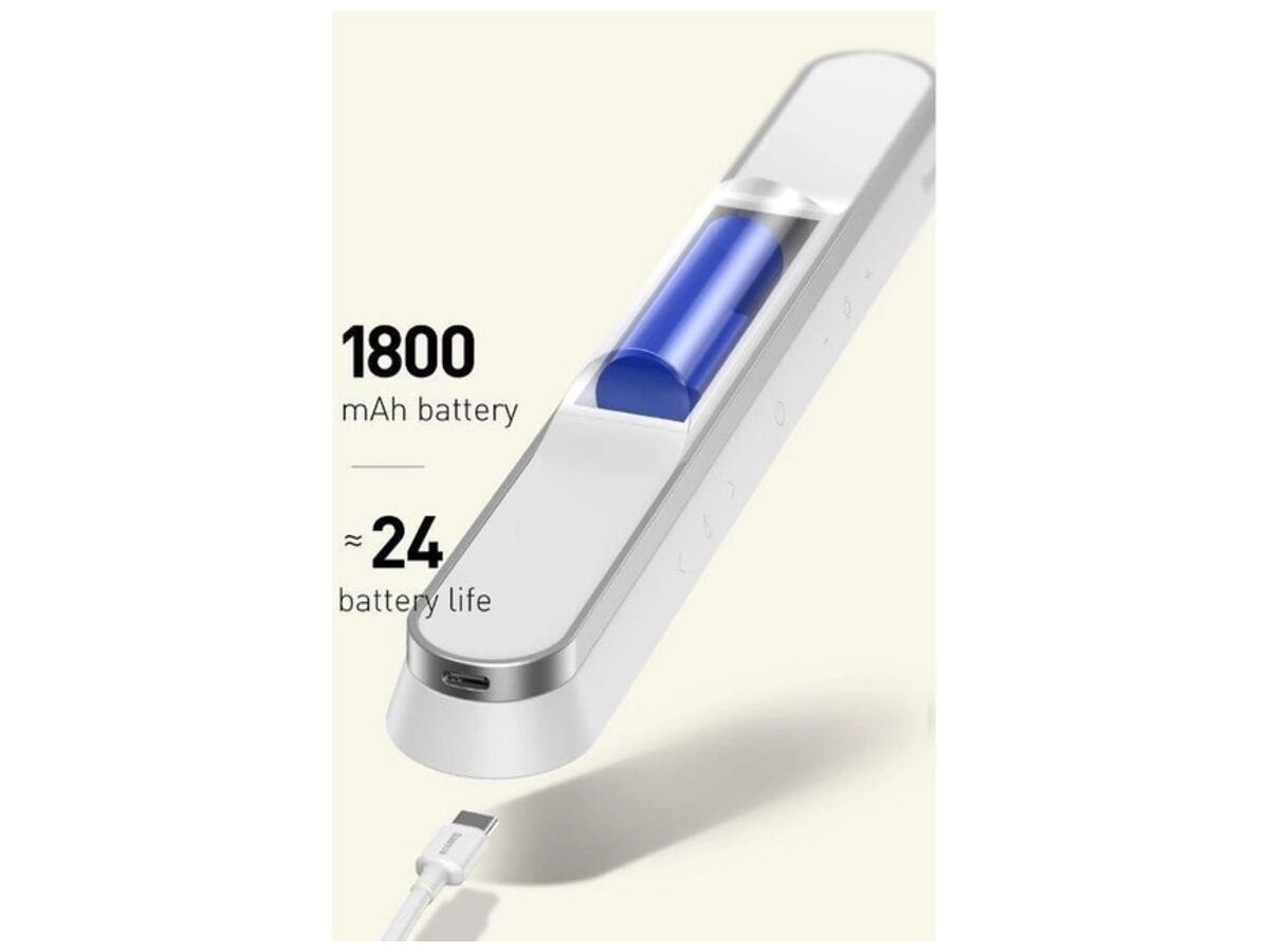 Светодиодная лампа с аккумулятором Baseus Magnetic Stepless Dimming Charging Desk Lamp питается от встроенного аккумулятора емкостью 1800 мАч, которого хватает примерно на 4-24 часа работы в зависимости от яркости. Входящий в комплект кабель USB-C позволяет быстро зарядить его.