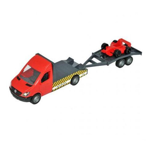 Пластиковая бортовая машинка "Mercedes-Benz Sprinter". Дверцы машины открываются/закрываются. Хорошо детализирована кабина. Размер машинки - 25х10 см. Диаметр колес - 3,5 см. Так же, в наборе есть лафет с машинкой. Выполнен набор из качественного пластика. Для детей от 3-х лет.