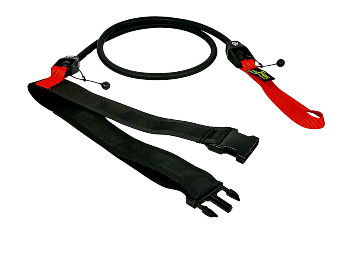 Тренажер надежно и удобно крепится на талии с помощью специального ремня с регулируемой застежкой, на конце троса расположена петля для крепления к бортику бассейна.