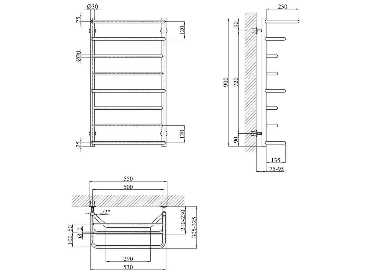 Модель крепится к стене с помощью крепежей, имеет верхнее и нижнее подключение к горячему водоснабжению. Диаметр подключения 1/2". Диаметр стойки - Г?30, толщина стойки - 1.5 мм, диаметр перемычки - Г?20, толщина перемычки - 1.5 мм. Максимальная рабочая температура до 90 °C. Рабочее давление - 15 Атм.