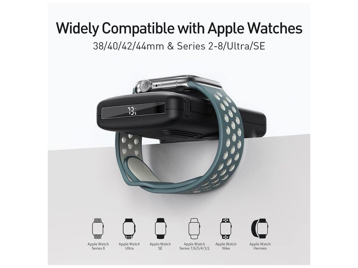 - широкая совместимость: это портативное зарядное устройство, совместимое со всеми сериями Apple Watch, Airpods, iPhone 15/14/13/12, также имеет выход для быстрой зарядки USB-C;