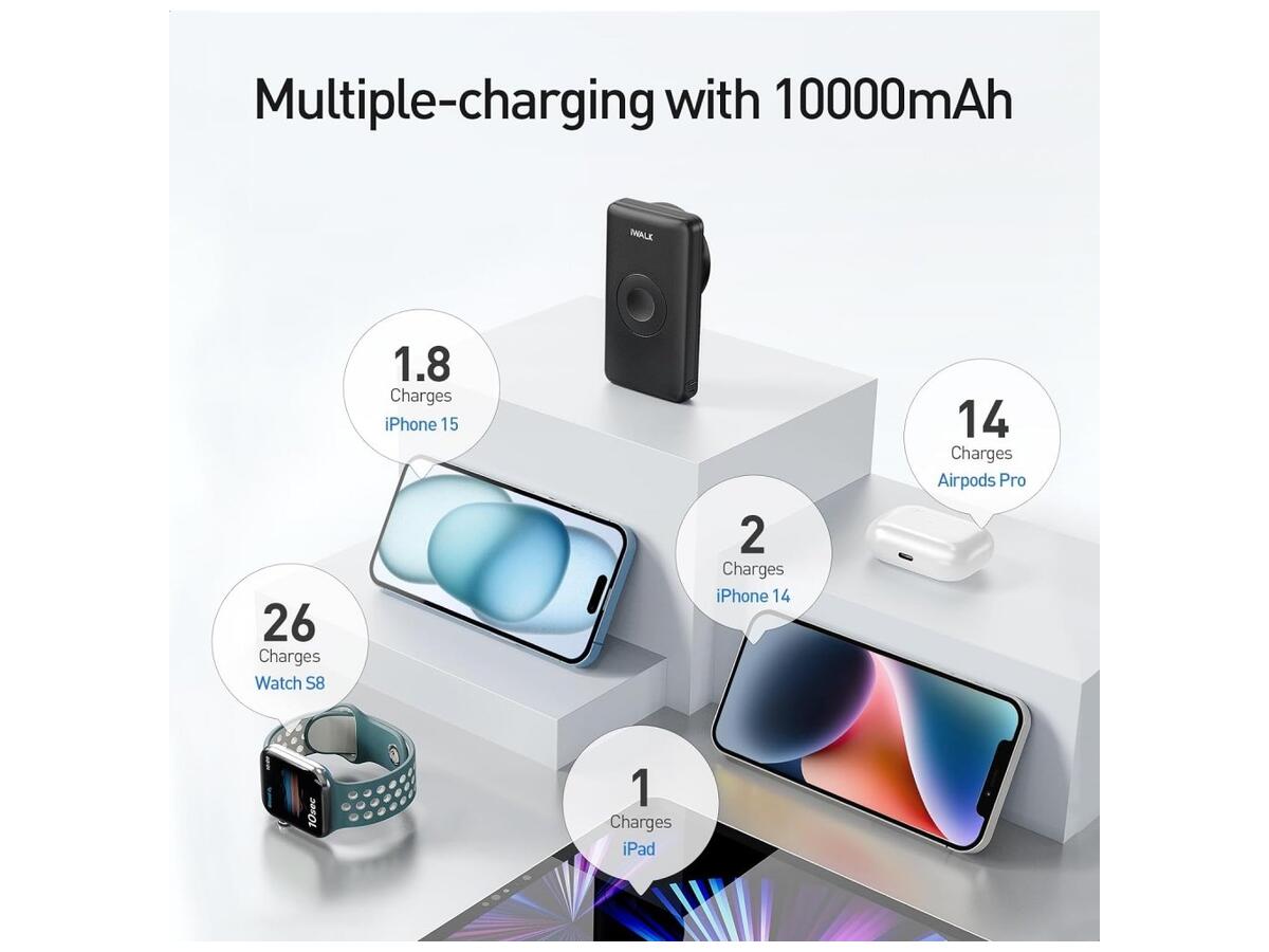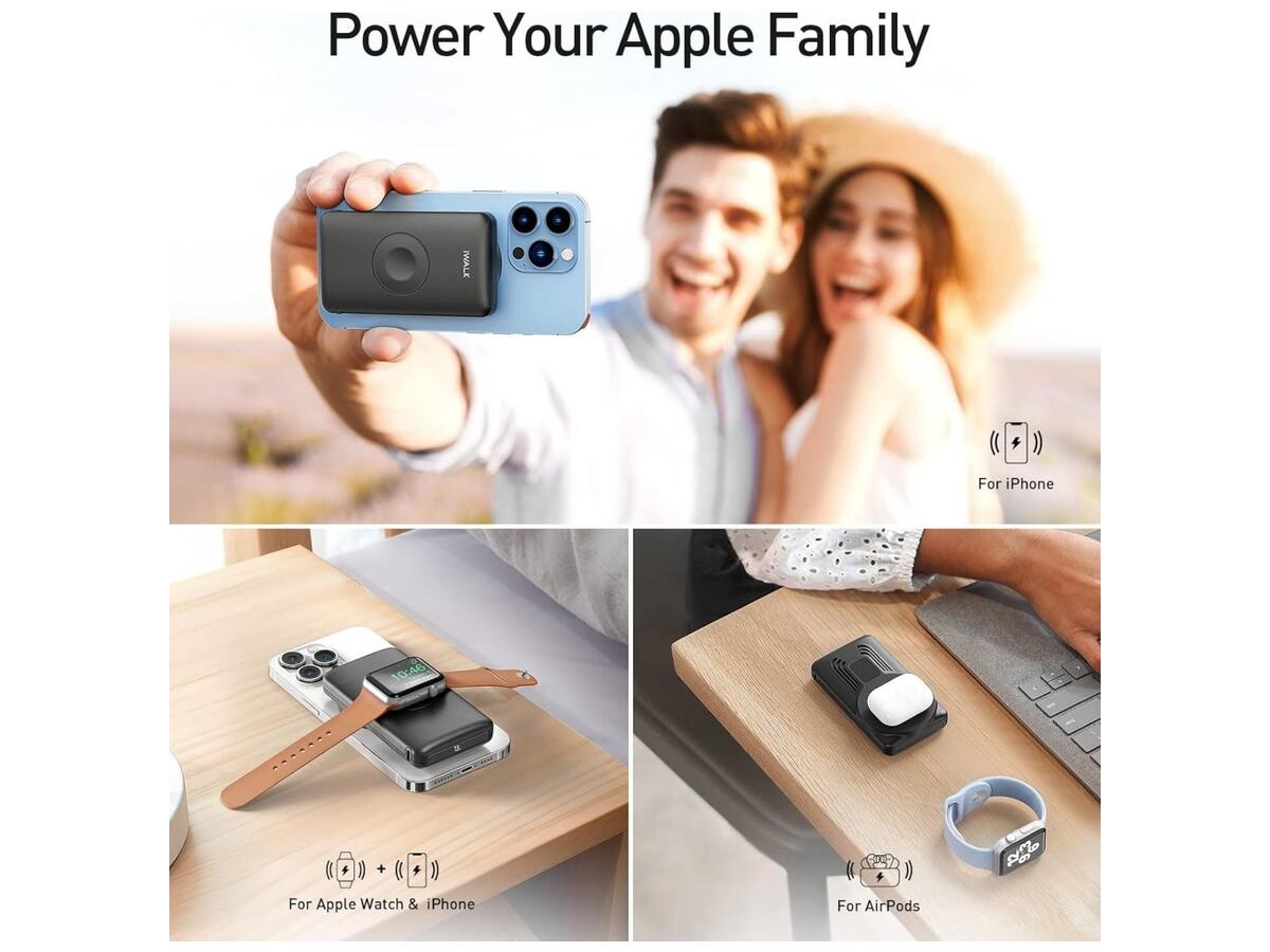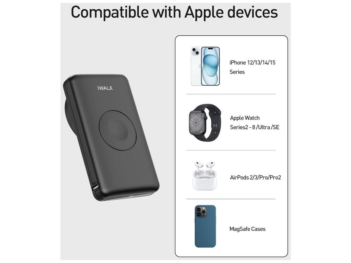 iWalk Mag-X имеет широкую совместимость со всеми сериями Apple Watch, AirPods и iPhone 15/14/13/12. Кроме того, он оснащен выходом для быстрой зарядки USB-C, что делает его универсальным решением для зарядки разных устройств.