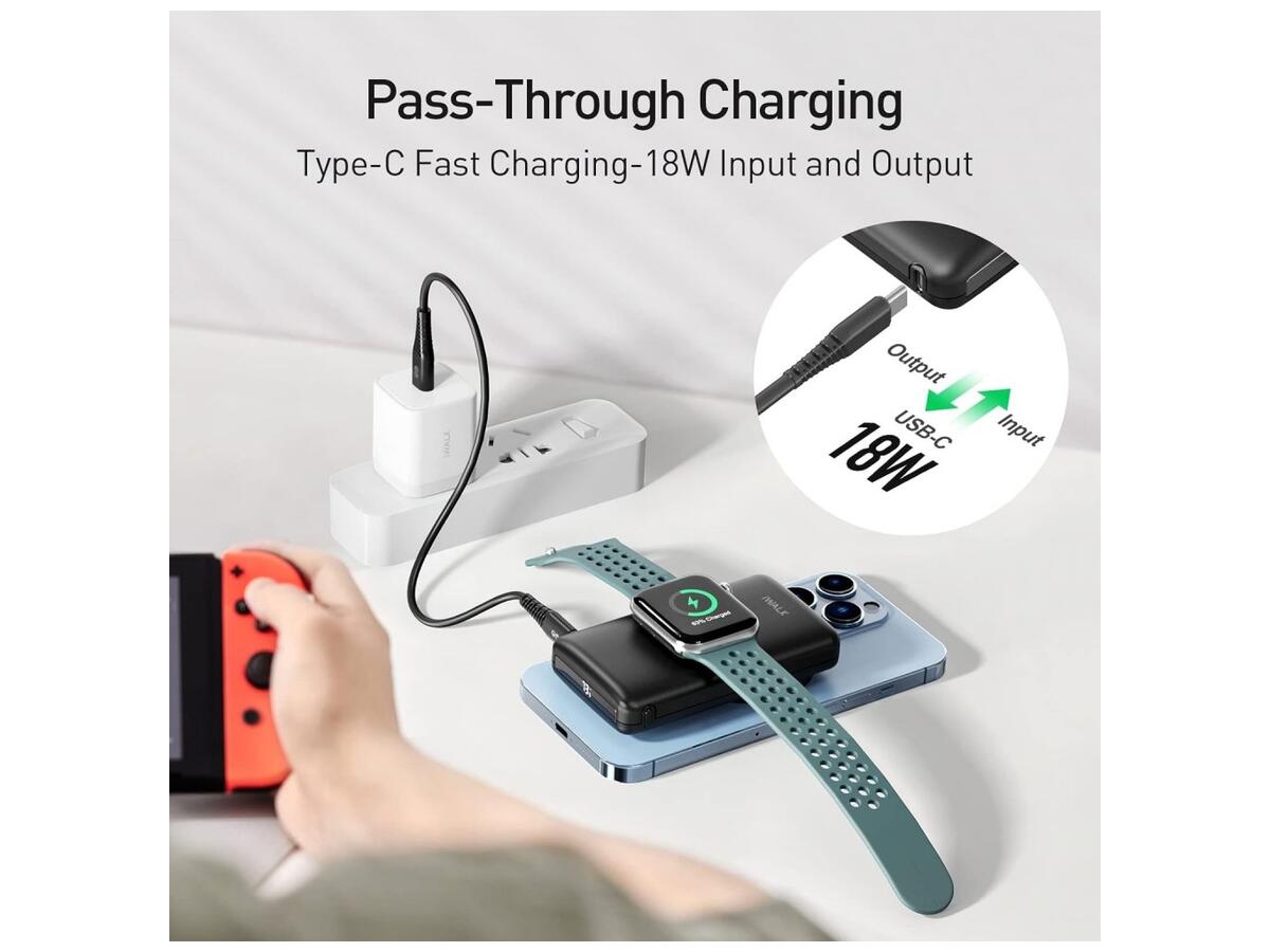 Кроме того, iWalk Mag-X поддерживает функцию сквозной зарядки, позволяющую заряжать само устройство одновременно с подключенными к нему iPhone или Apple Watch, обеспечивая непрерывную подачу энергии в оба устройства без задержек или прерываний.