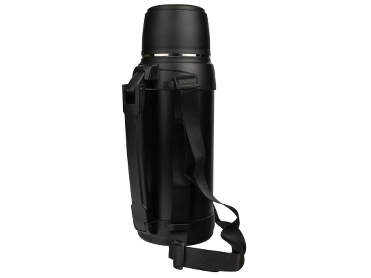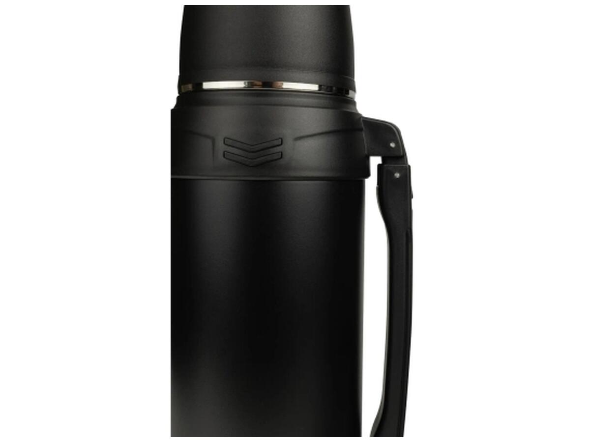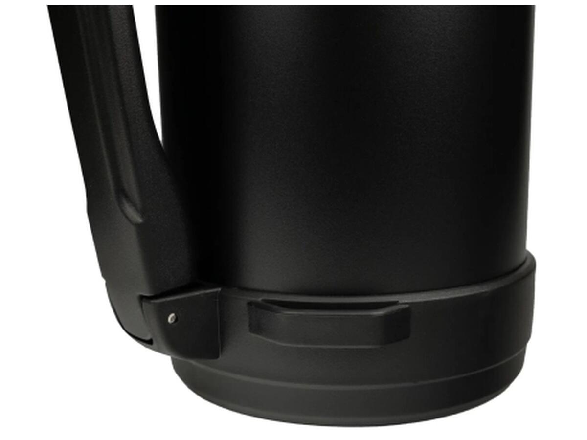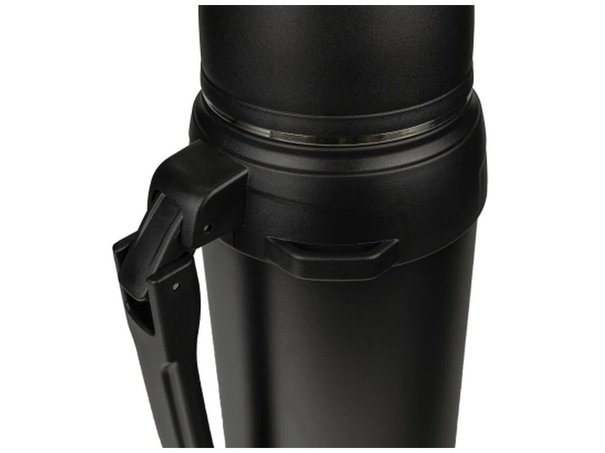 Наружное покрытие из порошковой краски защищает корпус от царапин, а пластиковые ободки сверху и снизу придают прочность. Удобная ручка позволяет легко переносить термос в руке, а дополнительный ремень – носить его на плечи.
