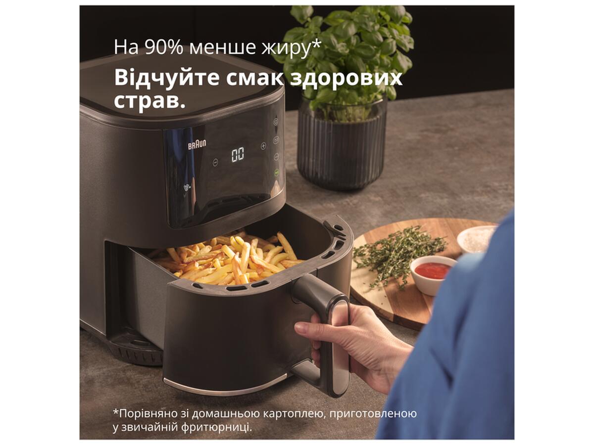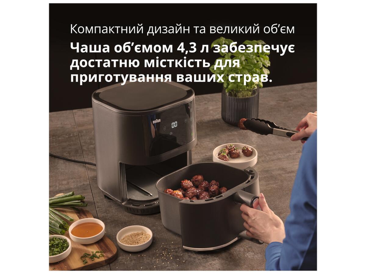 Компактный дизайн и легкая чистка Braun MultiFry 3 HF3030 впечатляет своим компактным дизайном, который идеально подходит для кухонь с ограниченным пространством. Несмотря на свой небольшой размер, он имеет емкость 4,3 литра и может готовить до 1 кг замороженного картофеля фри за раз.