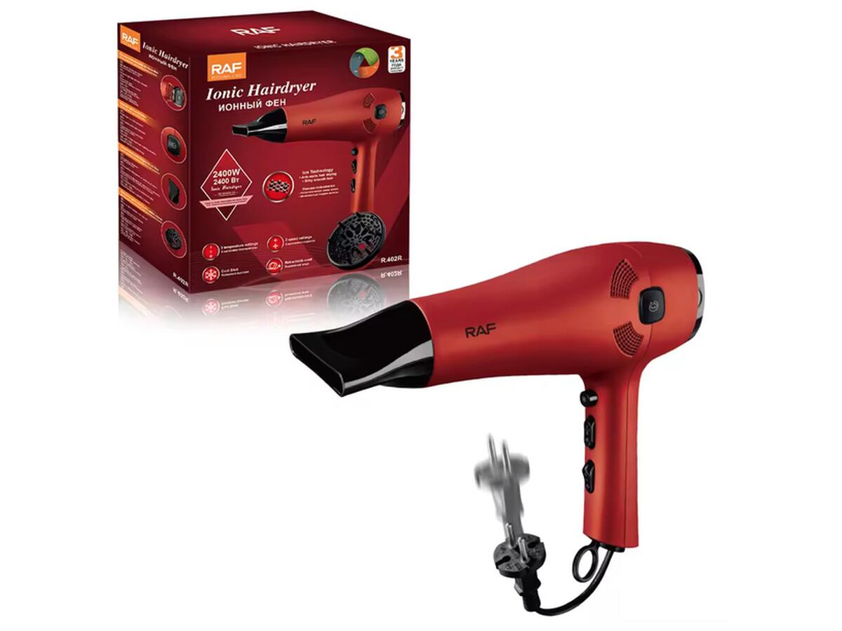 Фен RAF R402 — это надежный помощник как дома, так и в профессиональной среде. Он прошел строгие испытания, подтверждающие его надежность и качество сборки.