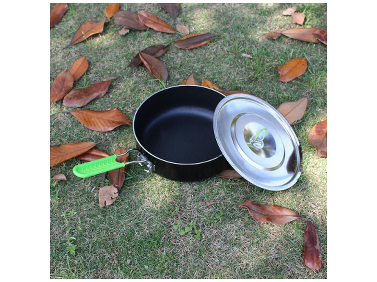Антипригарное покрытие гарантирует легкость приготовления блюд без прилипания и пригорания, что особенно ценится в походных условиях. Ручка и петля на крышке выполнены из пищевого силикона, обеспечивая комфорт и безопасность во время использования.