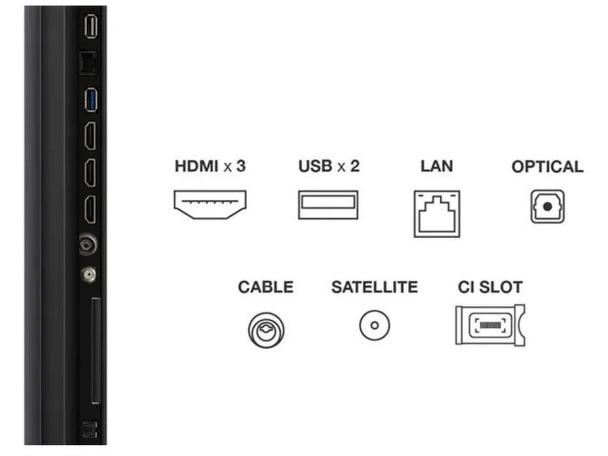 Телевизор оснащён множеством цифровых тюнеров (DVB-C, DVB-S/S2, DVB-T2), имеет встроенный Wi-Fi, Bluetooth и систему Google TV для удобного доступа к приложениям и потоковому контенту. Мощная аудио система с общим выходом 40 Вт создаёт объемный звук, дополняя впечатления от просмотра.