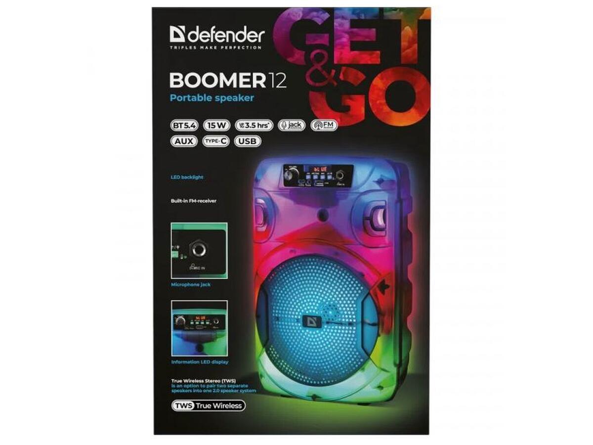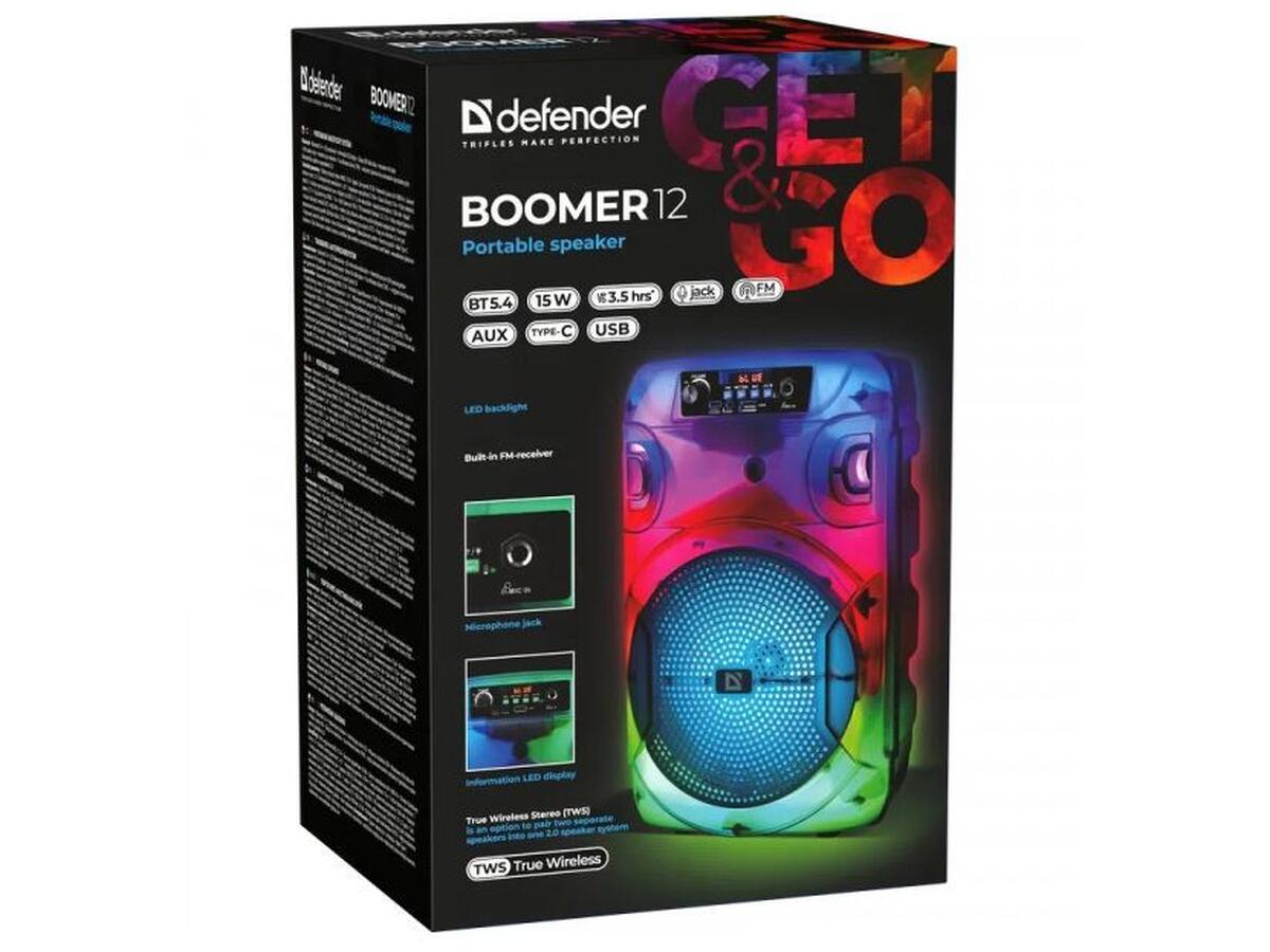 Defender Boomer 12 — это надежная и мощная портативная акустическая система, которая порадует качественным звуком и насыщенными басами. Современные технологии беспроводного подключения Bluetooth 5.4 обеспечивают устойчивую связь и удобство использования. Устройство поддерживает воспроизведение музыки с различных носителей — USB, microSD-карт и AUX.