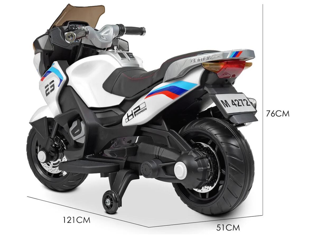 Комфортное кожаное сиденье и колёса из EVA-материала обеспечивают плавный и приятный ход. Размеры мотоцикла продуманы для малышей с учётом роста и удобства: длина 121 см, ширина 51 см, высота 76 см. Благодаря заряду аккумулятора (12V 9Ah), мотоцикл работает 8-12 часов зарядки на 1 ход.