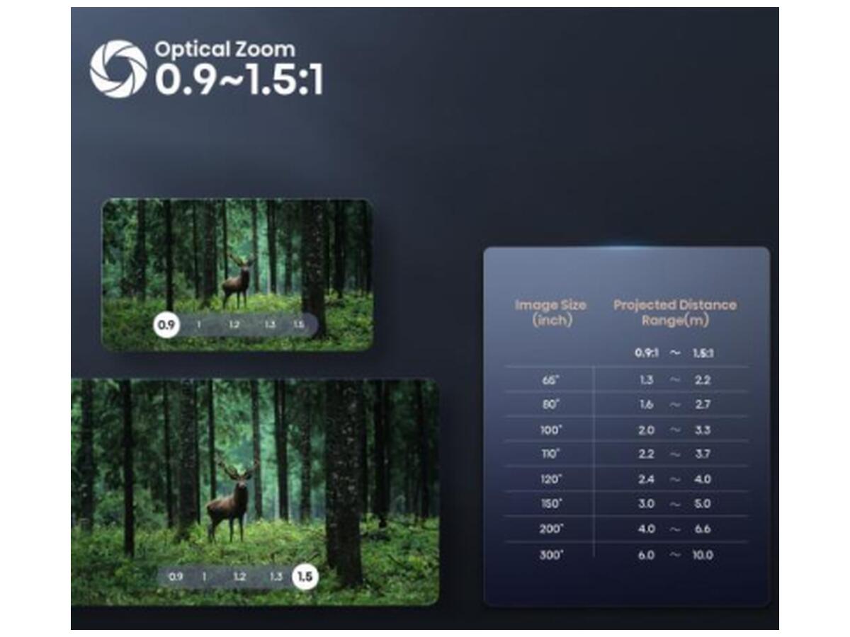 Проектор обладает широкими возможностями установки — поддерживает фронтальную и обратную проекцию, а гибкое увеличение позволяет добиться оптимального размера изображения от 1.65 до 7.62 метров по диагонали даже с минимального расстояния 1.1 метра.