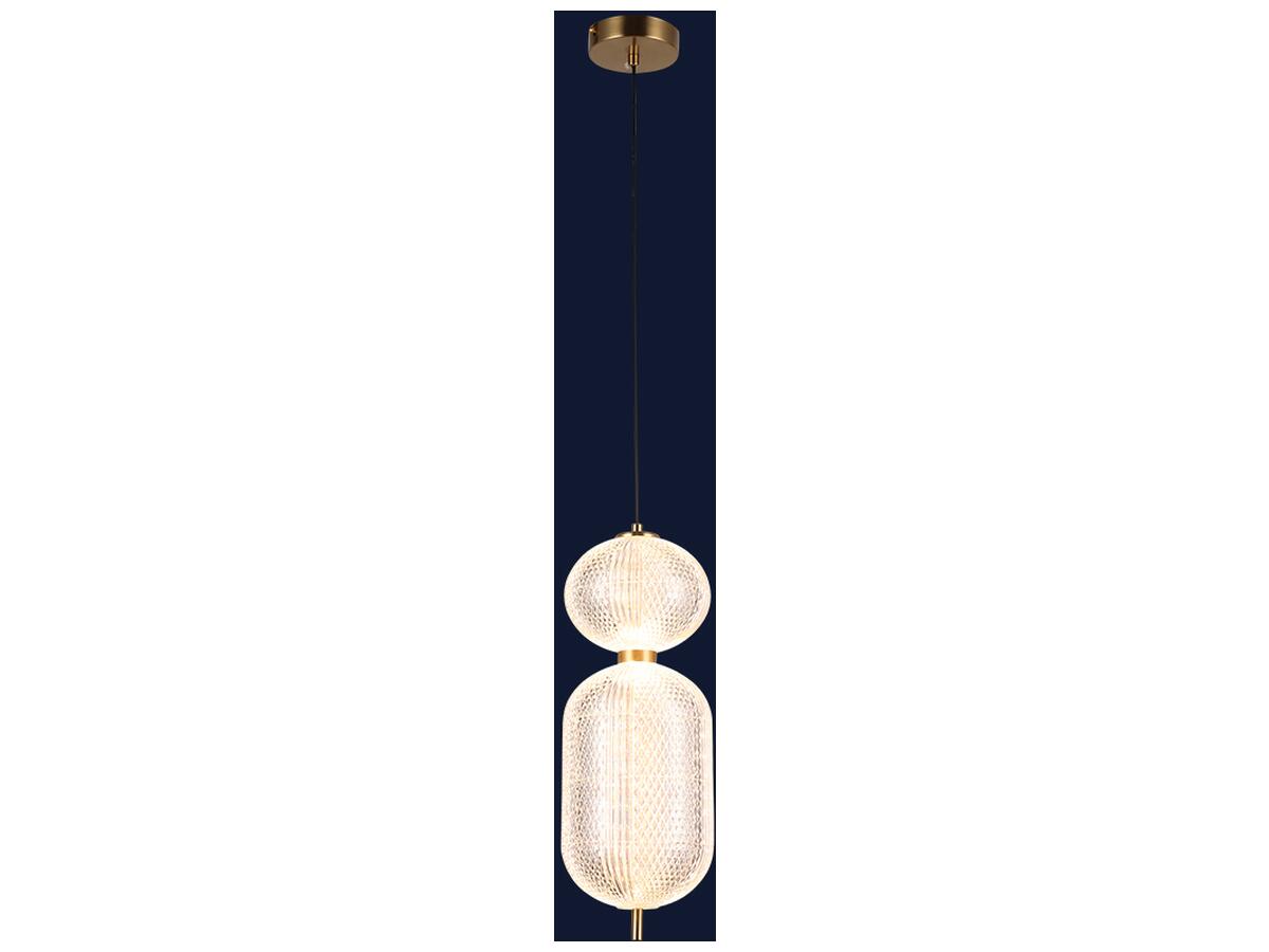 Светильник представлен в виде подвесного вертикального стержня, украшенного двумя овальными прозрачными плафонами с рифленой поверхностью, добавляющими эффект мягкости и изящества в интерьер.