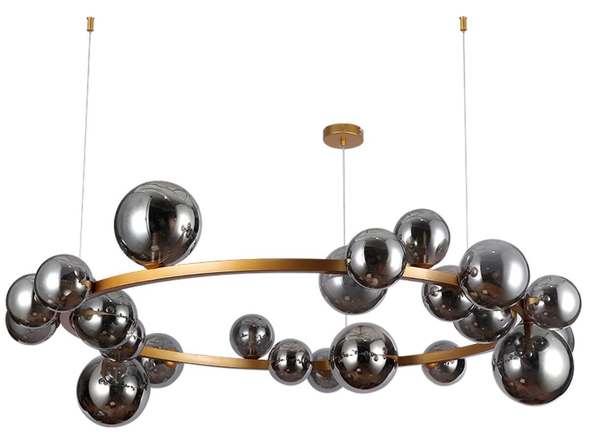 Люстра молекула подвесная кольцо Levistella 918LP267-24 XGD+BK золото, плафоны черные Современная подвесная люстра-молекула на 24 лампы со стеклянными плафонами-шарами разных размеров, на металлическом корпусе в виде кольца. Лучше всего эта люстра подойдет для освещения 50 мВІ помещения, при использовании лампочек 6 Вт (LED) или 40 Вт (галогенные), отлично подходит для высоких потолков. Высота регулируется, что позволяет адаптировать подвес под разные пространства и потребности. Люстра идеально впишется в интерьер гостиной, кухни, столовой, бара, кафе и ресторана. Она придаст интерьеру эстетики и создаст уютную атмосферу. Характеристики Источник света - 24 ламп Тип цоколя - G9 Максимальная мощность лампочки - 40 Ватт Возможность использования лампы: светодиодные LED, галогенные Комплектация лампочками - Нет Размеры плафонов: 100 мм, 120 мм, 150 мм Размер люстры - 1150 х 300 мм Размер упаковки: 102х102х21 (см) Высота (макс.) - 1300 мм Диаметр основания: потолочный круг 100 мм (1шт) + фиксаторы 15 мм (2шт) Тип крепления - 3 потолочных круга Материал крепления - Металл Материал плафонов - Стекло Цвет корпуса - Золотой Цвет плафонов - Черный Вид люстры: с плафонами, люстры-молекулы, люстра кольцо Тип люстры - Подвесные Форма плафона - Шар