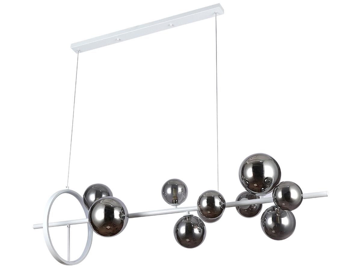 Люстра молекула подвесная Levistella 918LP267-10 WH+BK белая, плафоны черные Современная подвесная люстра-молекула на десять ламп со стеклянными плафонами-шарами разных размеров, на длинном горизонтальном металлическом корпусе в белом цвете, оснащена дополнительным LED кольцом. Лучше всего эта люстра подойдет для освещения до 30 мВІ помещения, при использовании лампочек 6 Вт (LED) или 40 Вт (галогенные), отлично подходит для высоких потолков. Высота регулируется, что позволяет адаптировать подвес под разные пространства и потребности. Люстра идеально впишется в интерьер гостиной, кухни, столовой, бара, кафе и ресторана. Она придаст интерьеру эстетики и создаст уютную атмосферу. Характеристики Источник света - 10 ламп G9 + LED 12 W 4000K Тип цоколя - G9 Максимальная мощность лампочки - 40 Ватт Возможность использования лампы: светодиодные LED, галогенные Комплектация лампочками - Нет Размеры плафонов: 100 мм, 120 мм, 150 мм Размер люстры - 1200 x 300 мм Высота регулируется - максимум 1250 мм Крепление: 700 x 50 x 20 мм Тип крепления - монтажная планка Материал крепления - Металл Материал плафонов - Стекло Цвет корпуса - Белый Цвет плафонов - Черный Вид люстры: с плафонами, люстры-молекулы, декоративные Тип люстры - подвесные Форма плафона - шар