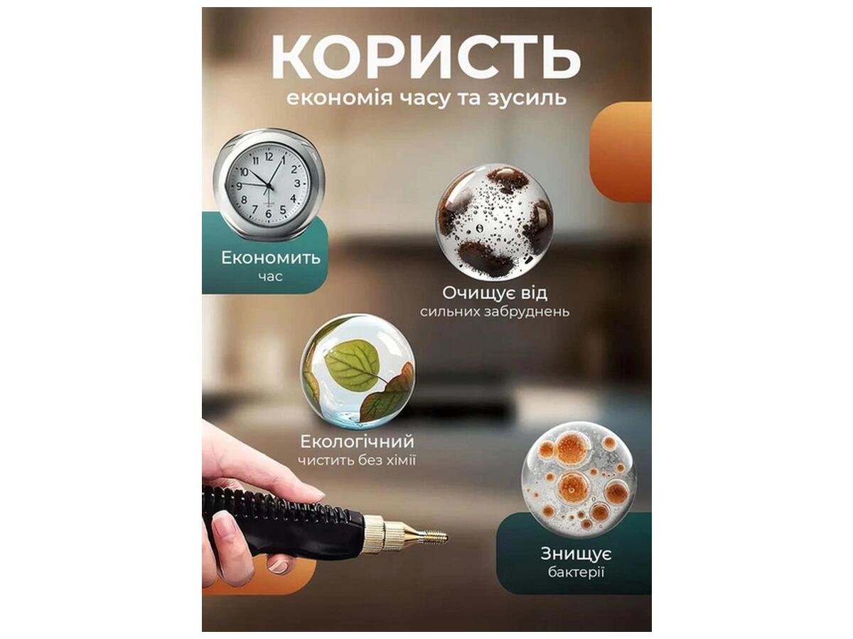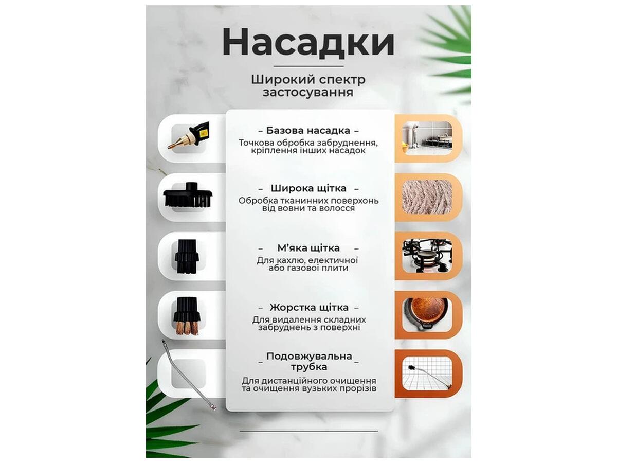 Преимущества: Быстрый нагрев — всего 15 секунд, большой резервуар 1500 мл для длительного использования без дозаправки, 28 насадок для уборки различных поверхностей: пол, ковры, окна, текстиль. Компактный дизайн и удобная ручка делают работу комфортной.