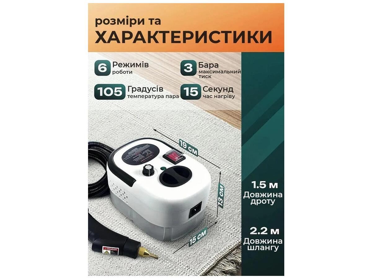 Инструкции по использованию: Заполните резервуар чистой водой, включите устройство, подождите 15 секунд до нагрева. Используйте соответствующую насадку для нужного типа поверхности, регулируйте интенсивность пара механическим переключателем. После использования опорожните бак и дайте устройству остыть.