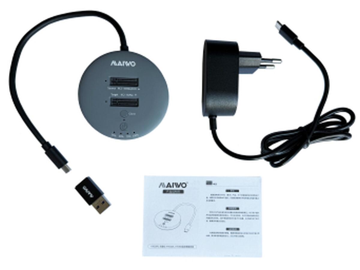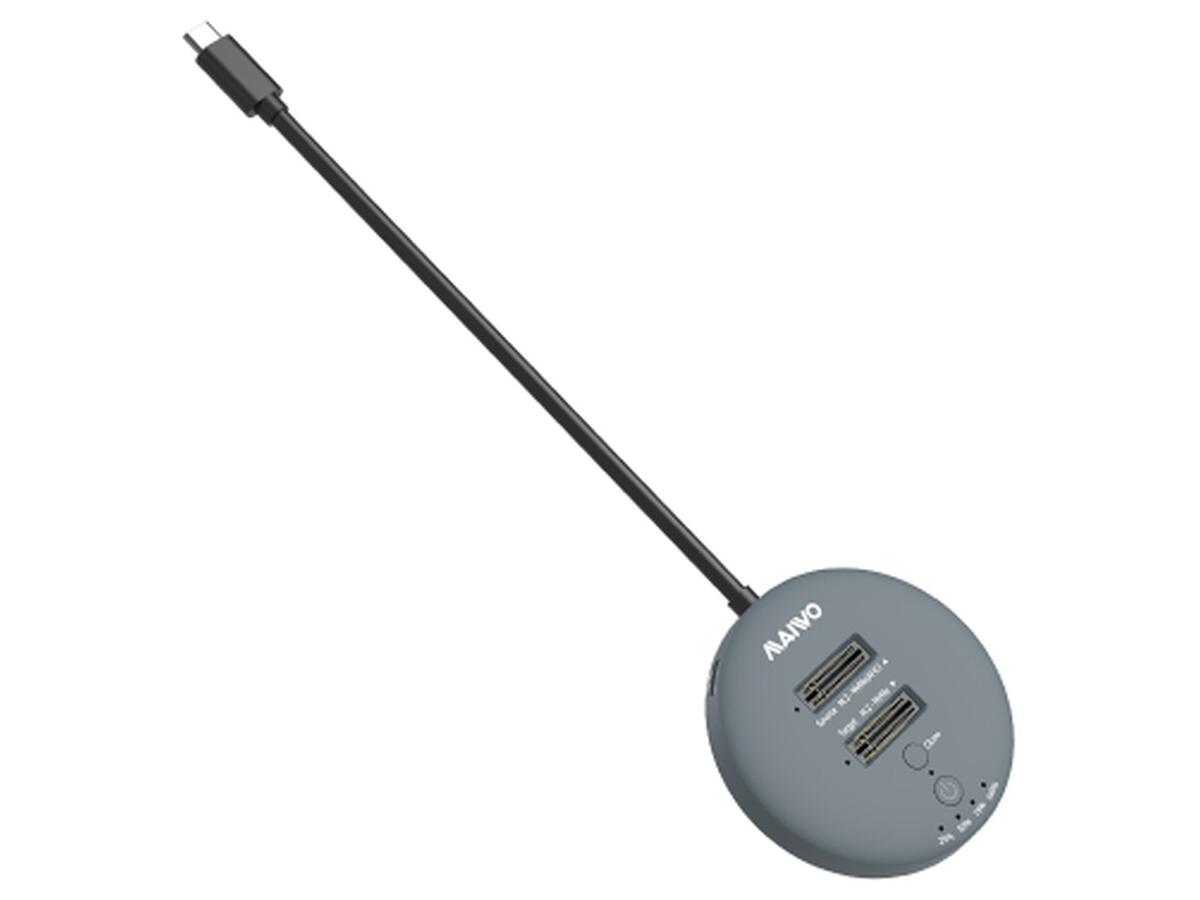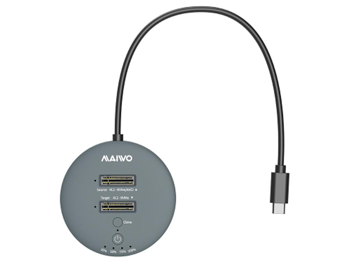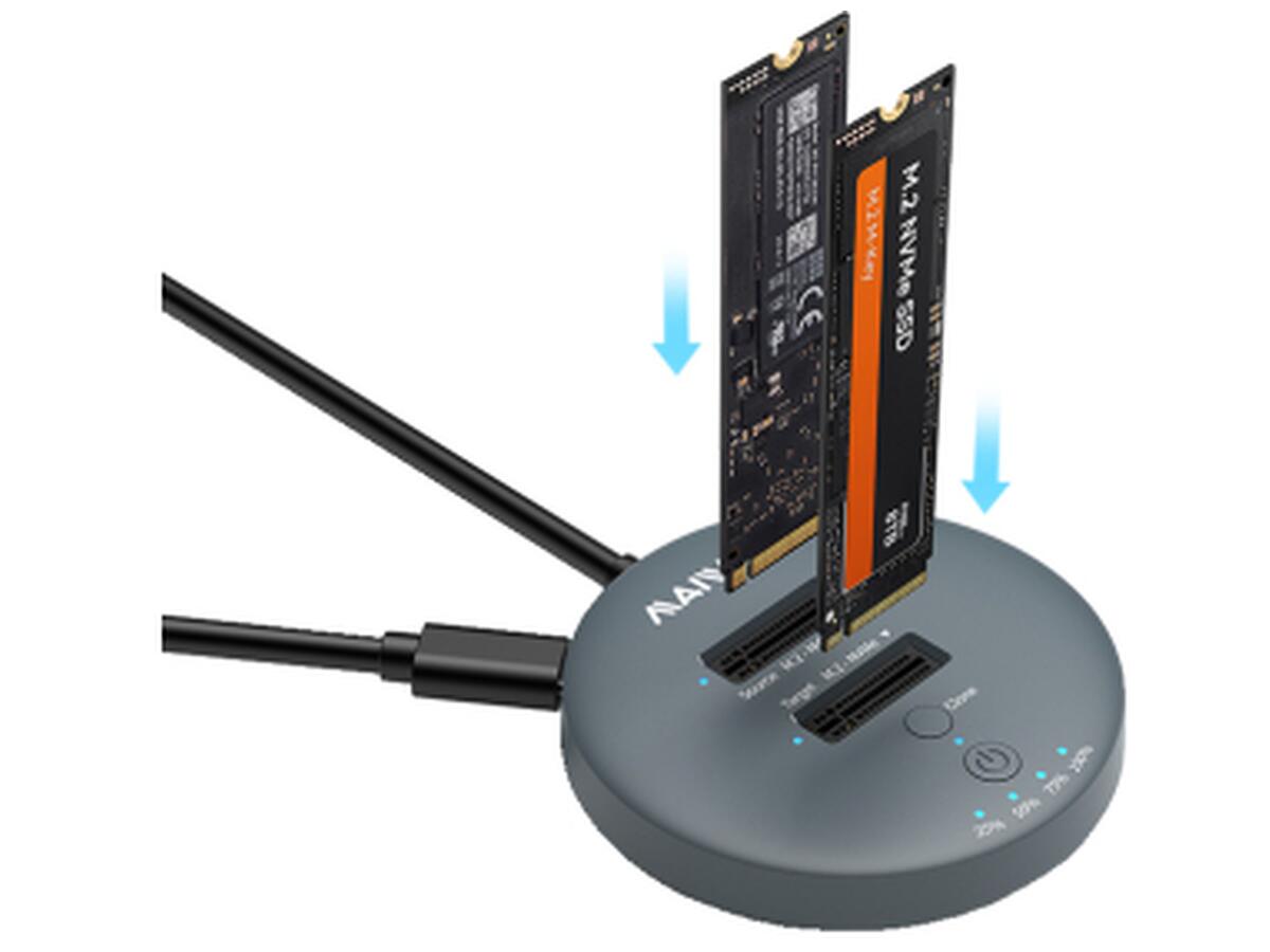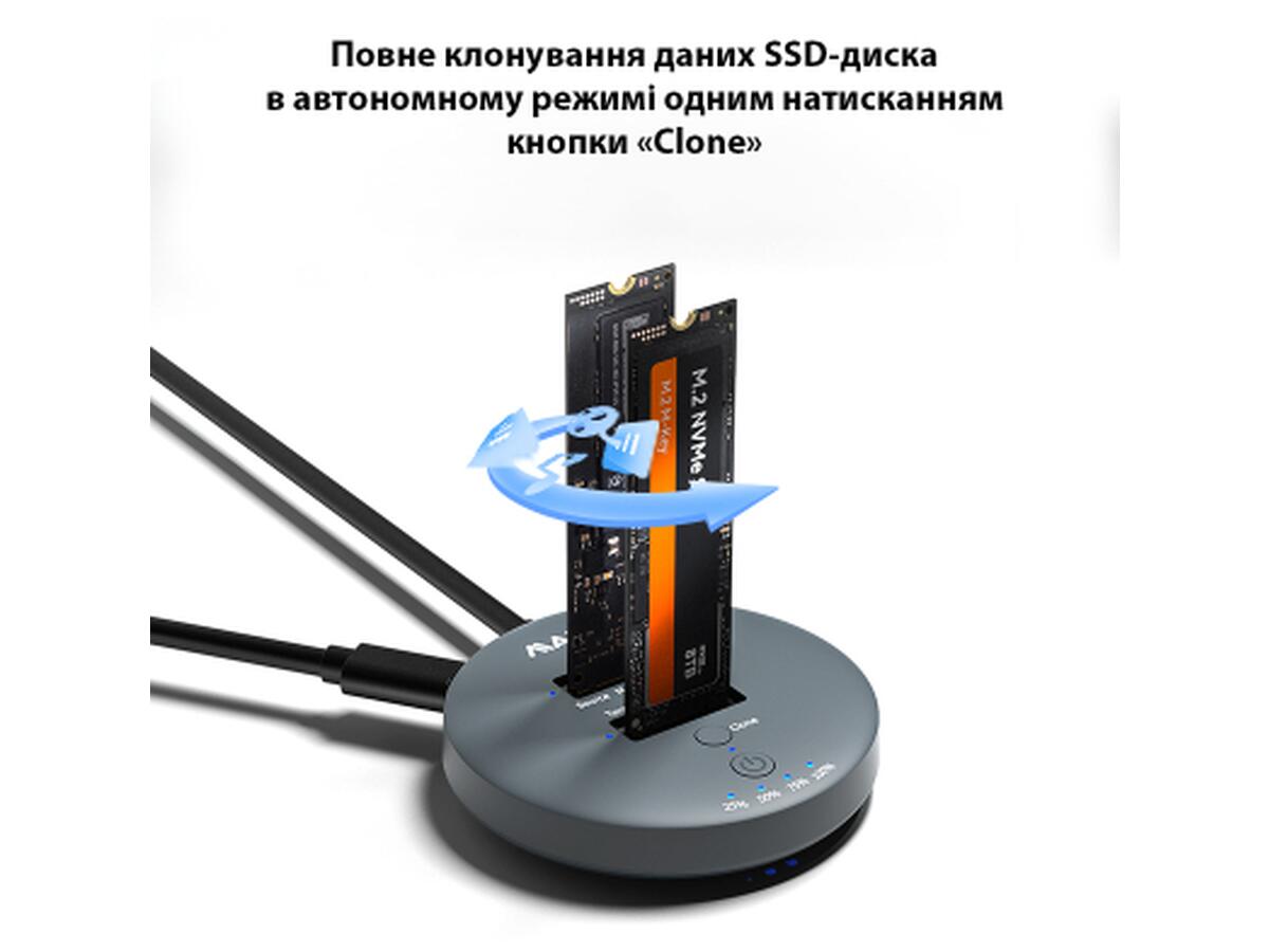 Док-станция, дубликатор Maiwo K3026P2 с функцией клонирования дисков предназначена для двух твердотельных накопителей - M.2 SSD NVMe (PCIe) / AHCI SSD. Она может клонировать диск 1 (Source) на диск 2 (Target) нажатием одной кнопки (без подключения к компьютеру). Также с помощью данной док-станции K3026P2 можно считывать или записывать данные на накопители SSD, подключив ее к ноутбуку, компьютеру, смартфону, smart TV, Smart Router, PS3/PS4/XBOX через кабель USB. Таким образом док-станция K3026P2 позволяет использовать SSD накопители как внешние жесткие диски USB.
