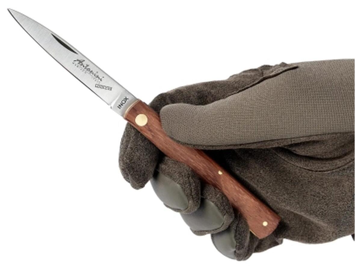 Antonini Pocket Siciliano, как заметно из названия, вдохновлен классическим, прямым профилем ножей из Сицилии. Данная модель является идеальным утилитарным ножом для повседневного использования и даже приготовления пищи на кухне. Клинок ножа выполнен из нержавеющей стали 420, открывается обеими руками и не имеет фиксирующего замка. Такое конструктивное решение позволит смело использовать нож почти по всему миру. Прямая рукоять выполнена из дерева Сапели, которое широко используется в производстве музыкальных инструментов, в частности, электрогитар. Декоративные элементы и заклепки изготовлены из латуни.