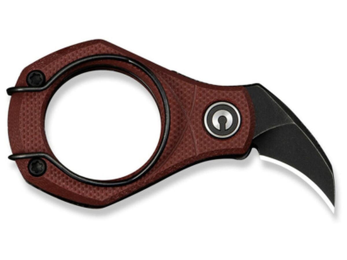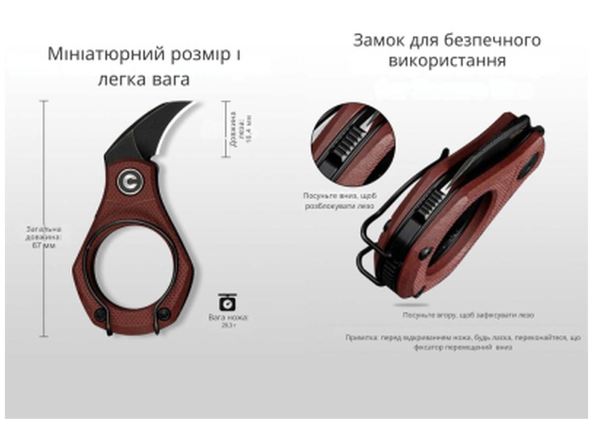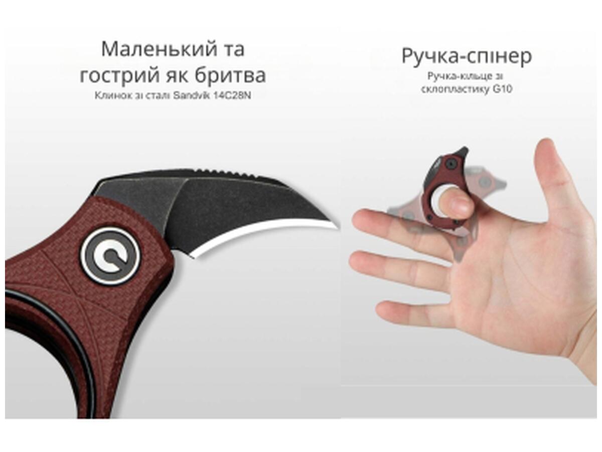 Несмотря на миниатюрные размеры (всего 57,4 мм в закрытом положении), модель не лишена эргономики, за которую отвечают шероховатые накладки из G10 на рукояти. В конструкции также есть клипса на карман, которую можно использовать как зажим для денежных купюр или кольцо для ношения ножа в качестве брелока.