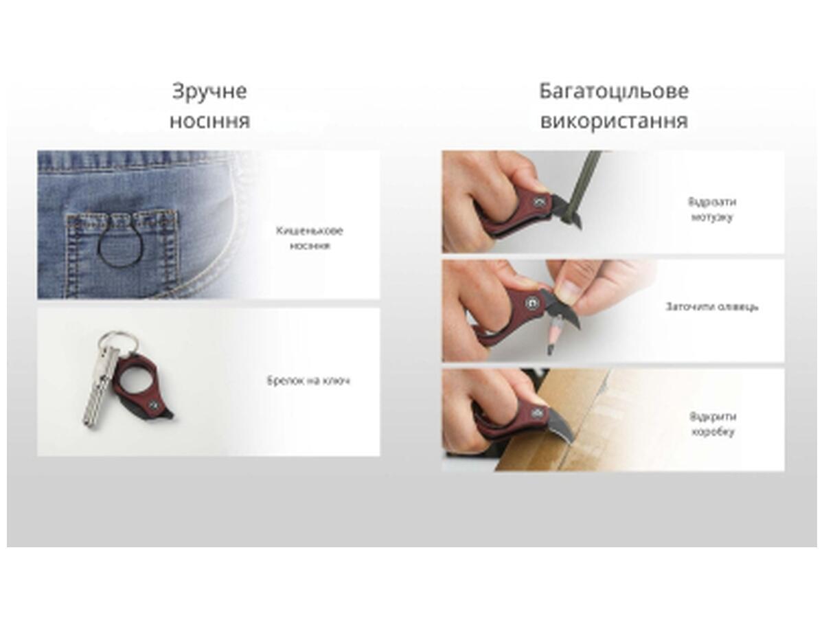 Civivi Pyrus справляется с задачами разного типа — от реза картона и веревок до заточки карандашей. Все благодаря закругленному клинку с профилем Hawkbill, который напоминает клюв ястреба. Материал лезвия — шведская сталь Sandvik 14c28n нержавеющего типа со степенью твердости 57-59 HRC, что позволяет сократить частоту заточки клинка до минимума и исключить вероятность деформирования кромки.