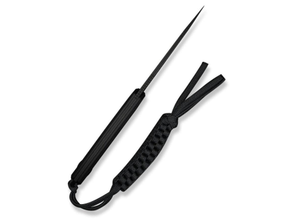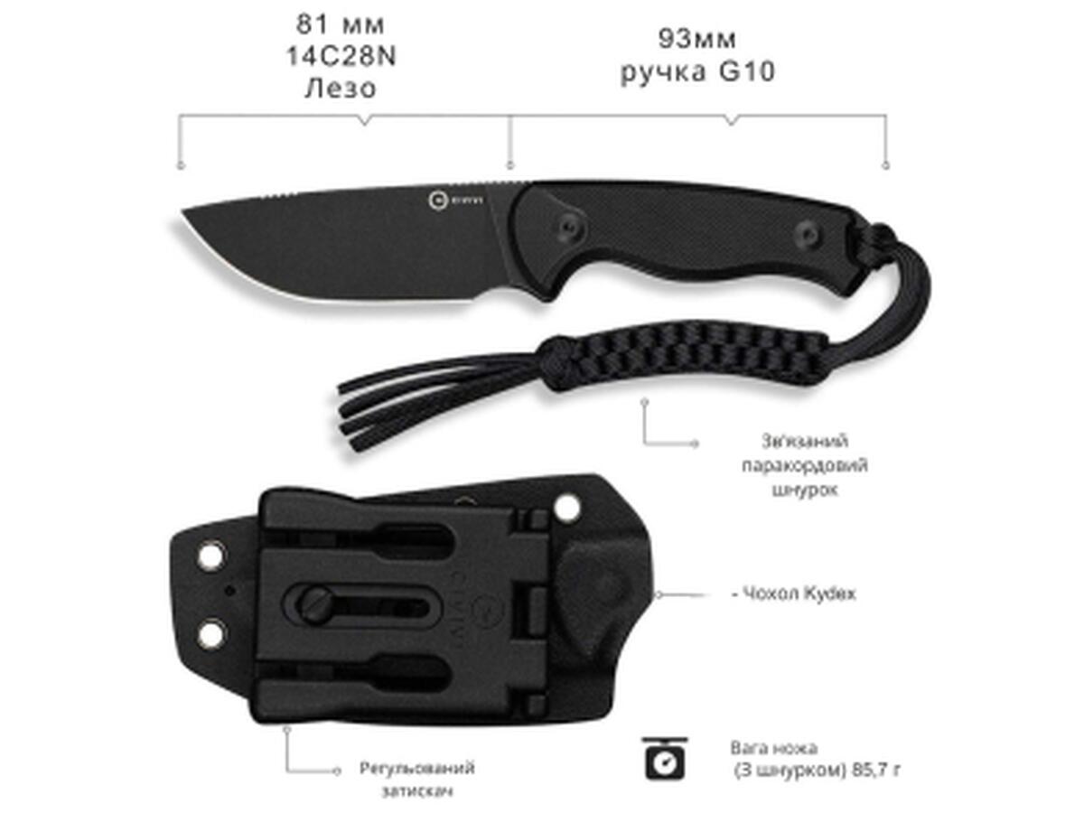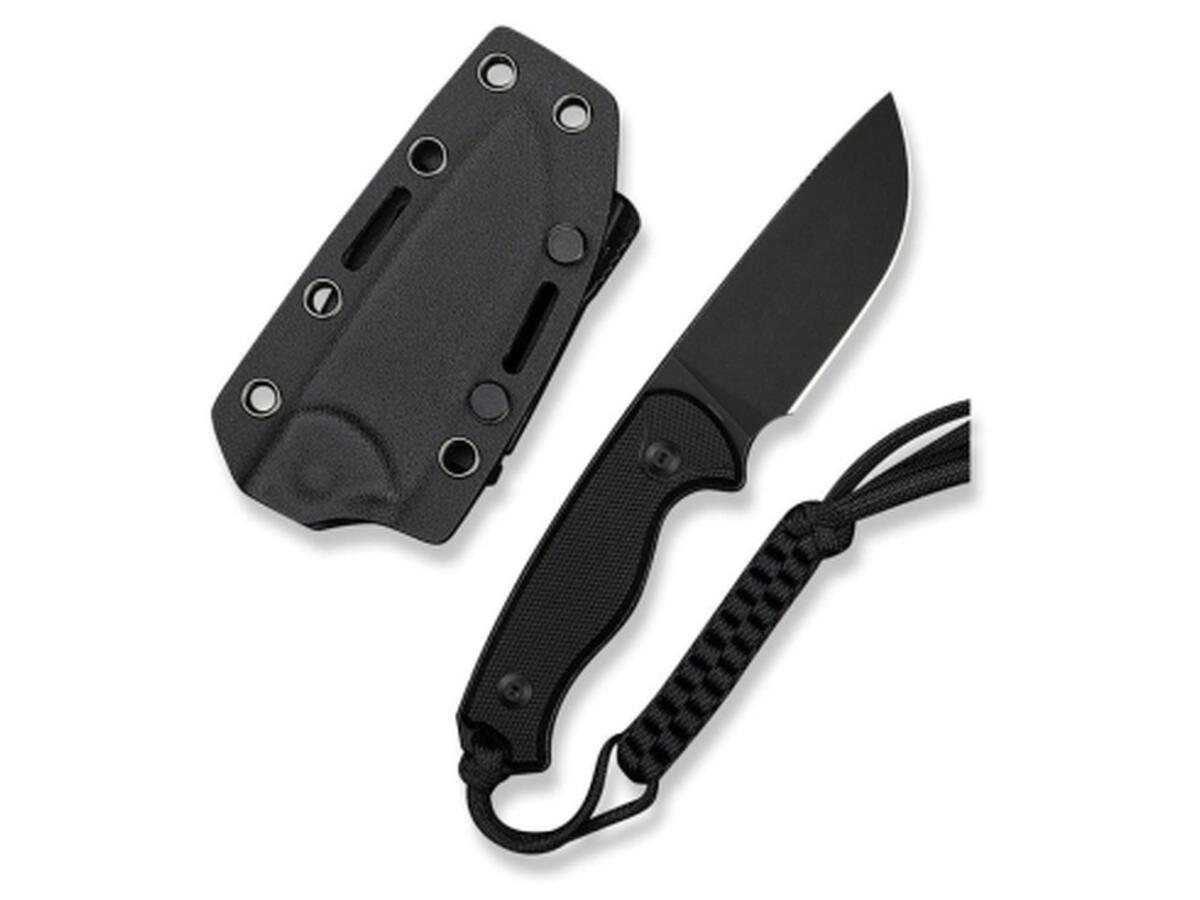 Хвостовая часть дополнена плетеным паракордом в качестве украшения. Комплект также включает ножны из кайдекса с зажимом, разработанным ножевым дизайнером Бобом Терзуола. Зажим с вращающейся системой фиксации позволяет устанавливать нож в наиболее удобном для вас положении: вертикально или горизонтально.