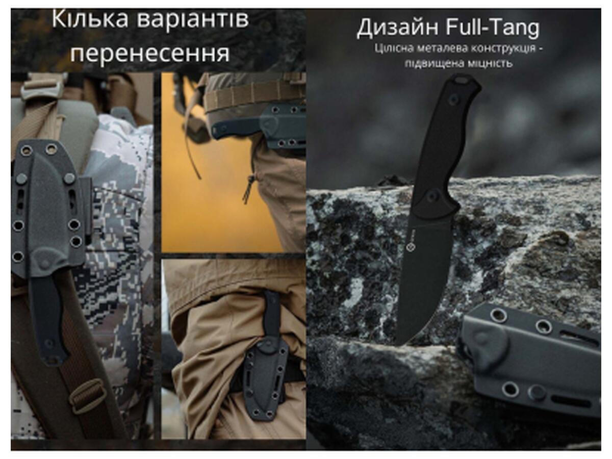 Инструмент имеет конструкцию Full-Tang, в которой клинок и рукоять изготовлены из цельного куска металла. Это повышает износостойкость ножа и делает его невосприимчивым к высоким нагрузкам.
