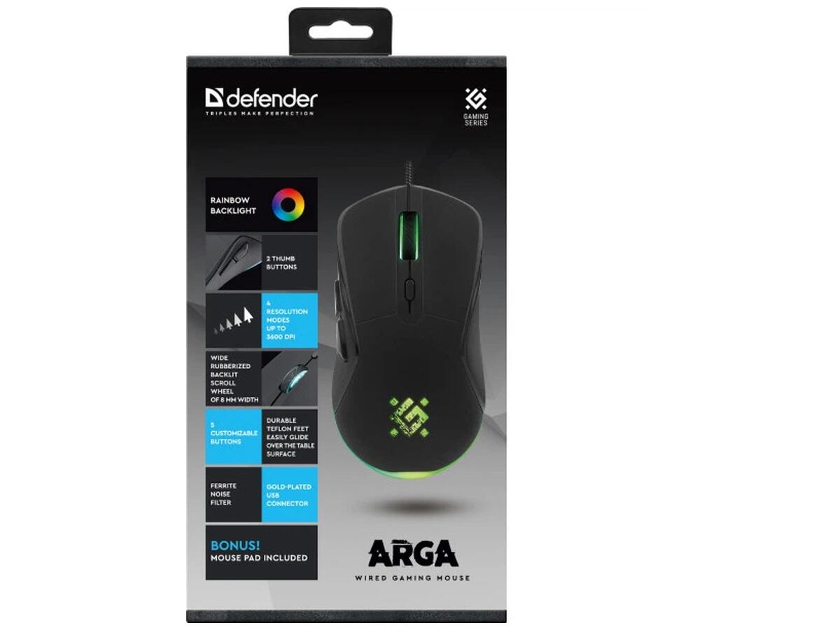 Игровая мышь Defender Arga GM-049 — это современное устройство для геймеров, которое сочетает высокую точность, удобство и стильный дизайн. Она станет надёжным инструментом в любых игровых ситуациях, обеспечивая точное позиционирование и комфорт даже при длительных игровых сессиях. Благодаря яркой LED-подсветке с эффектом rainbow и эргономичной форме мышь приятно лежит в руке и создаёт идеальные умови для работы и игр. В комплекте поставляется качественный игровой коврик, который обеспечивает оптимальное скольжение без необходимости дополнительных покупок.
