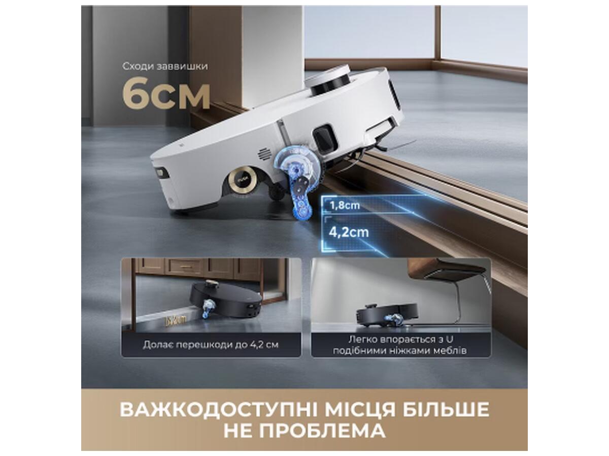 Робот-пылесос оснащен выдвижной ногой и специальным рычагом перед каждым ведущим колесом для преодоления одноуровневых ступеней высотой до 6 см. Перед преодолением препятствий бинокулярный датчик определяет их высоту и выбирает оптимальную стратегию. Во время преодоления препятствия нижние датчики ToF измеряют расстояние поднятого робота над препятствиями и землей для безопасного спуска и подъема.
