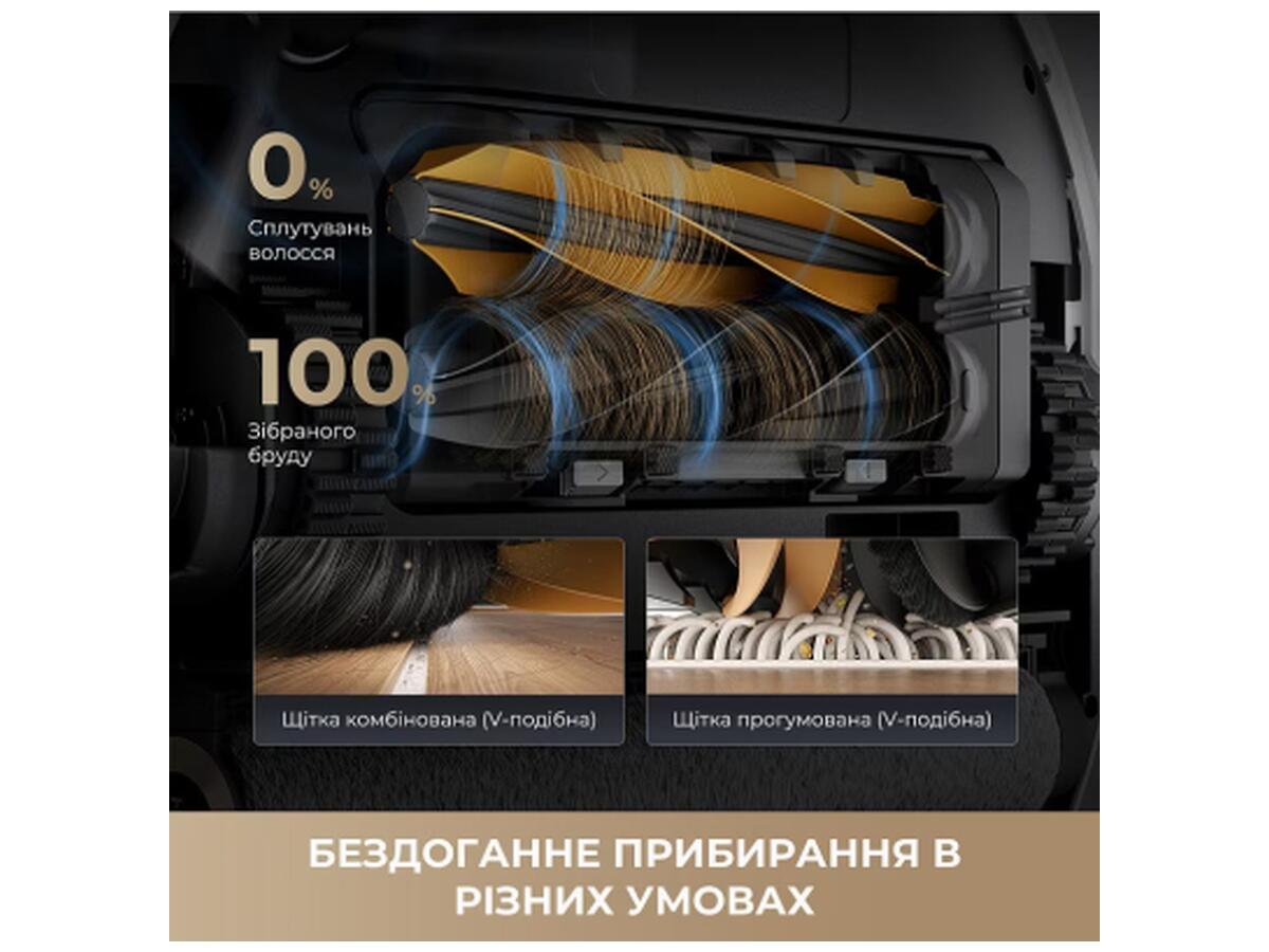 Двойная щетка вместе с боковой щеткой адаптируется к различным напольным покрытиям и коврам, эффективно убирая грязь и волосы, не путая их и обеспечивая высокий уровень очистки.