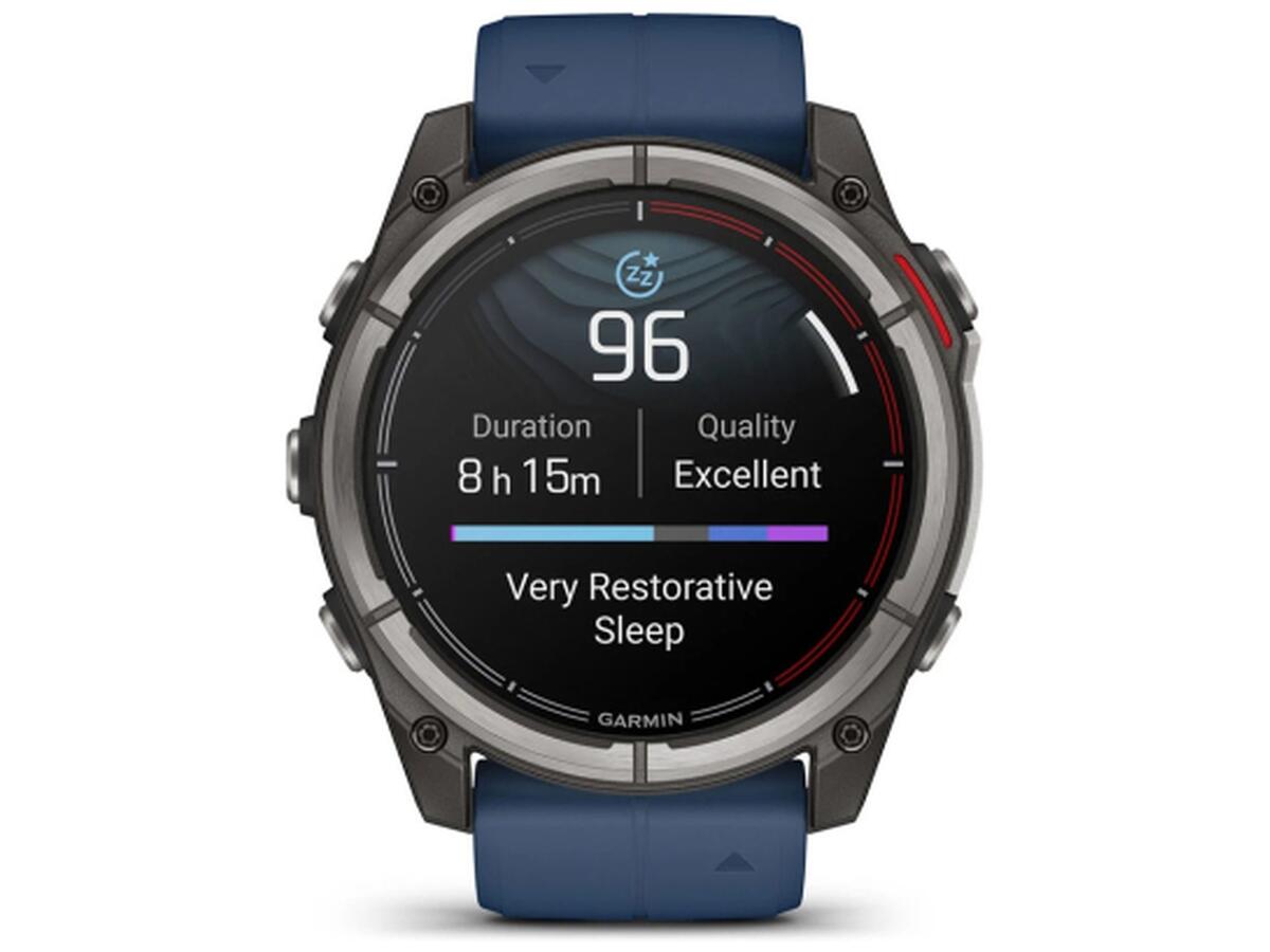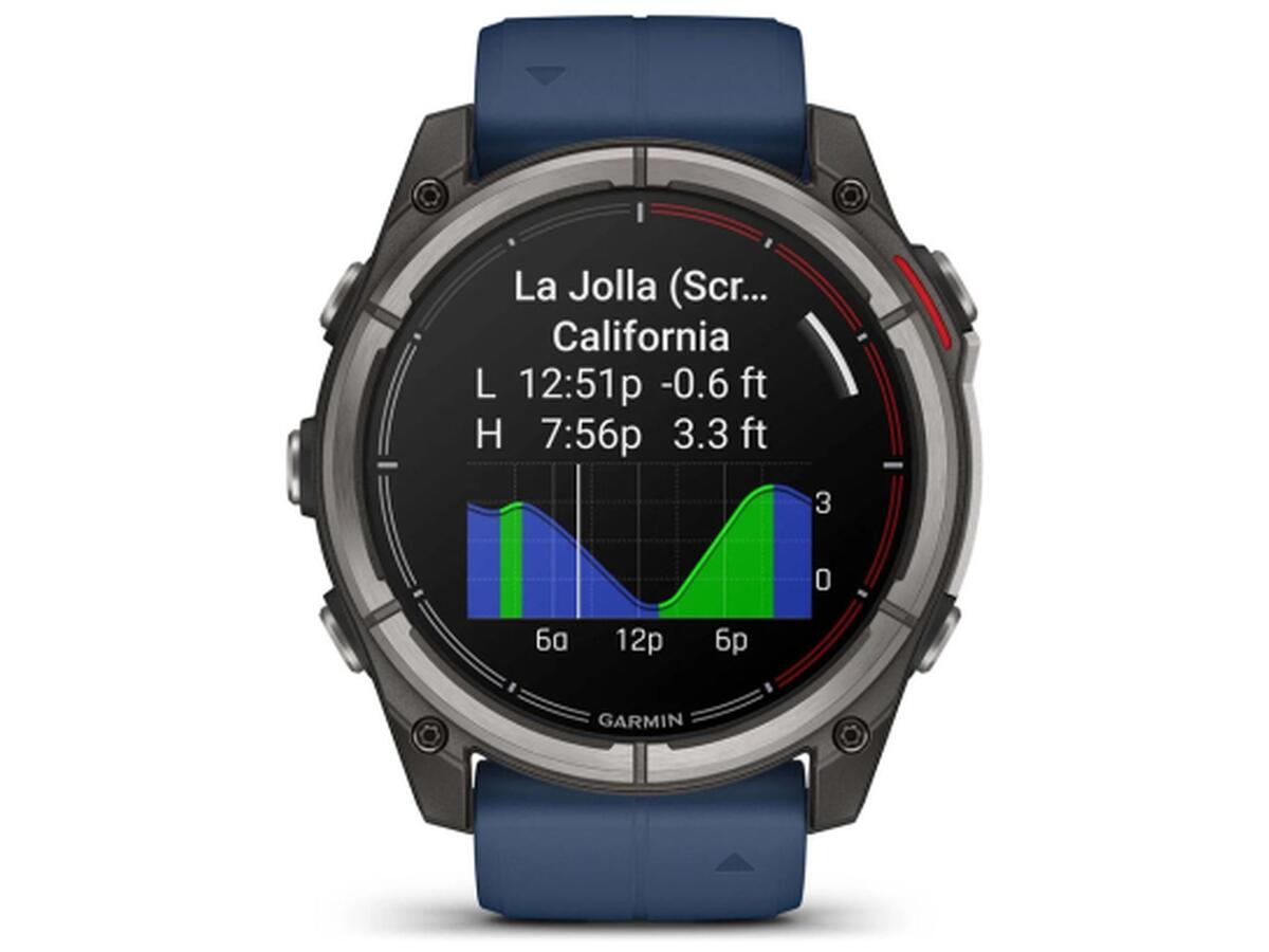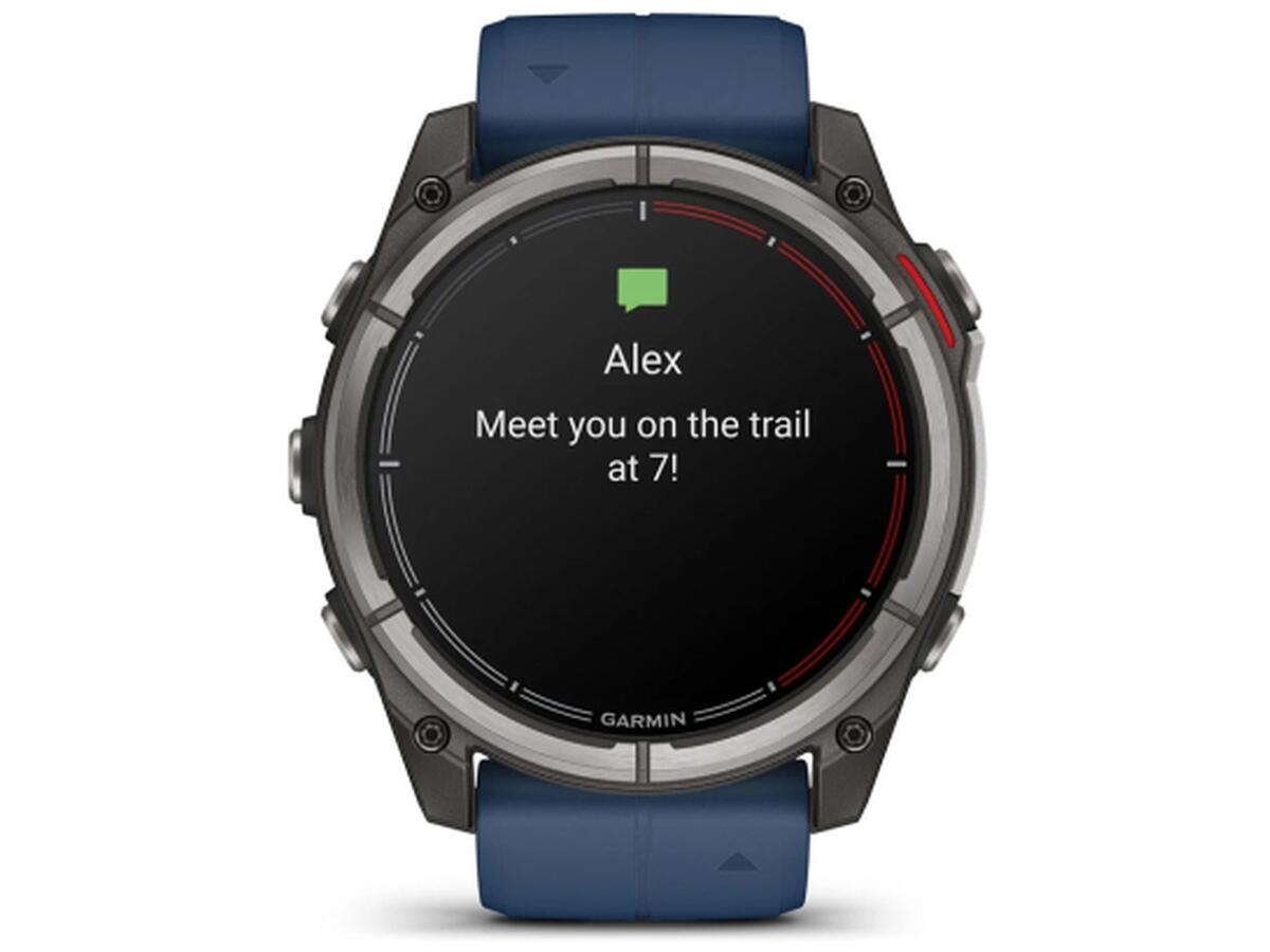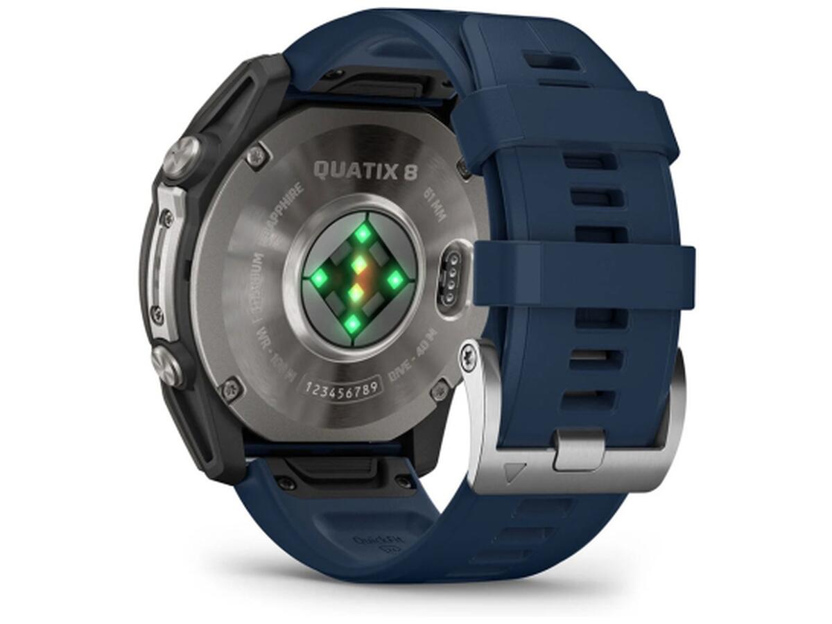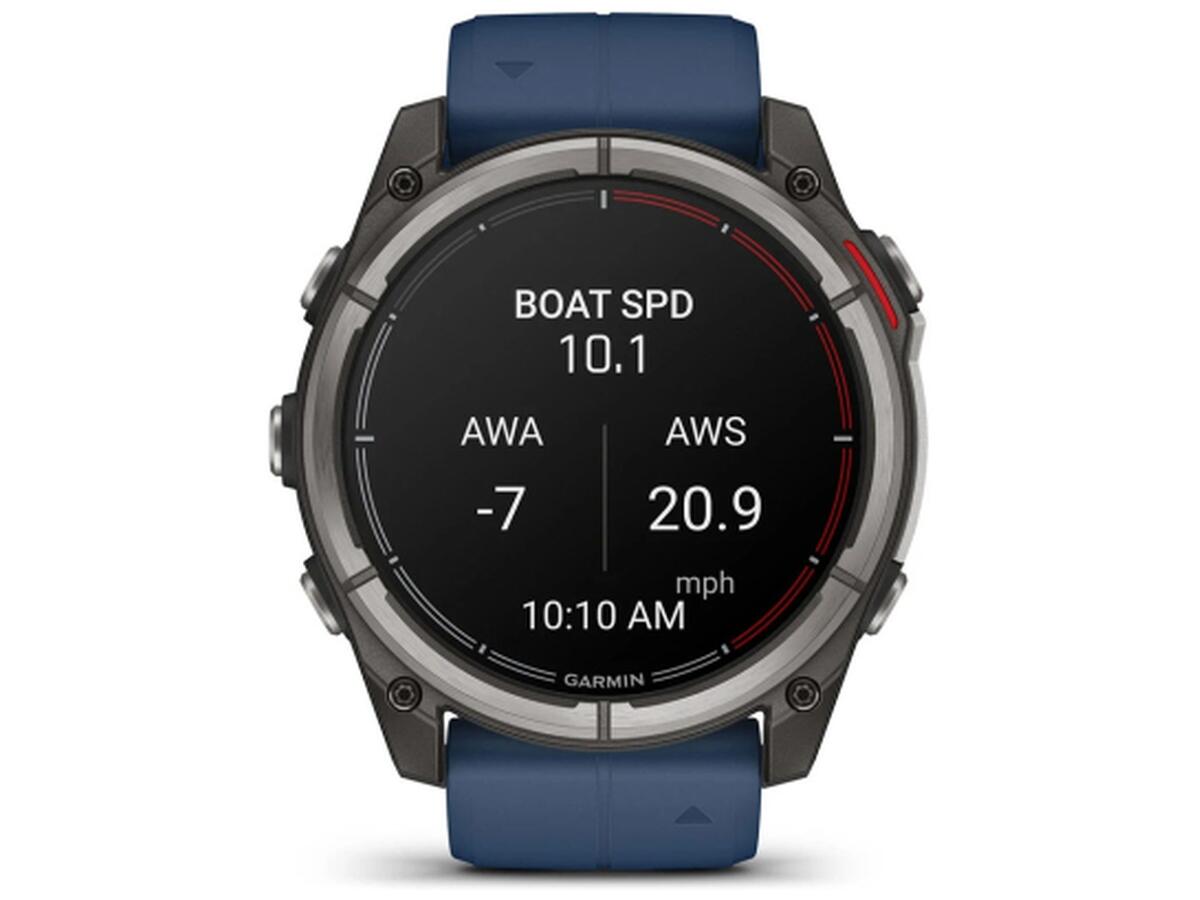 Смарт-часы Quatix 8 имеют водонепроницаемые кнопки, металлический кожух для дополнительной защиты датчиков и яркий 1.4-дюймовый AMOLED-дисплей с устойчивой к царапинам сапфировой линзой и прочным титановым ободком. Дизайн – с характерной для серии Quatix красной цветовой схемой таймера регаты на циферблате и фирменным темно-синим силиконовым ремешком.