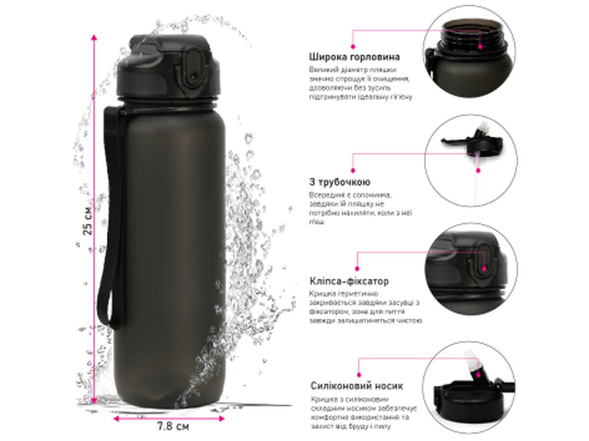 Завдяки герметичній кришці з силіконовим носиком і кліпсі-фіксатору, пляшка забезпечує зручність і захист від забруднень. Ергономічна конструкція та ремінець для перенесення дозволяють брати її з собою на тренування, в офіс або в дорогу.