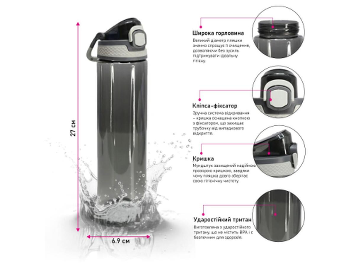 Крышка оснащена кнопкой с фиксатором, что предотвращает случайное открывание и обеспечивает защиту. Имеет ручку-карабин. Пластиковый носик с откидной защитной крышкой обеспечивает гигиеничность и удобство во время использования. TPR-вставки по бокам крышки обеспечивают надежное удержание и комфортное открывание даже мокрыми руками. Благодаря широкому горлышку бутылка легко моется и быстро наполняется.