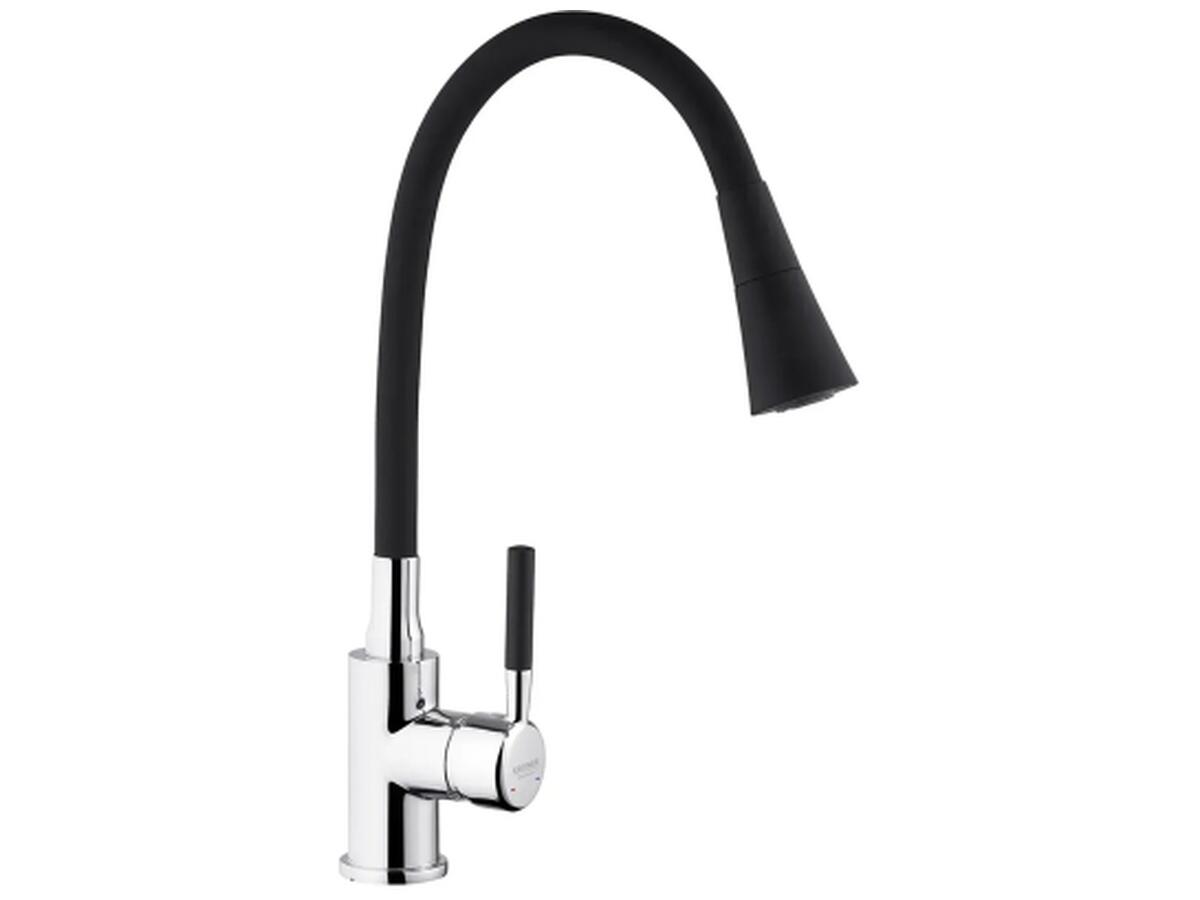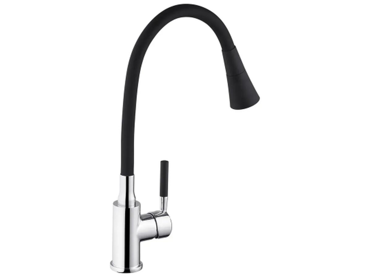 Смеситель для кухни Kroner KRM Kuche – C132BLK – это стильный и функциональный вариант для вашей кухни. Изготовлен из высококачественного силумина с силиконовым изливом, он совмещает прочность и удобство в эксплуатации. Однорычажное управление позволяет легко регулировать температуру и поток воды.