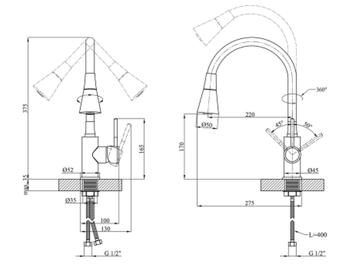 Смеситель имеет высоту 375 мм, ширину 100 мм и глубину 275 мм. Излив в форме U-образной имеет гибкий и поворотный тип, что обеспечивает удобство использования. Высота излива составляет ~170 мм, а длина – около 220 мм. Диаметр подключения шлангов - 1/2". Механизм смешивания обеспечивает плавную и эффективную регулировку температуры воды. Диаметр картриджа составляет 35 мм, что гарантирует надежную работу в течение длительного времени.
