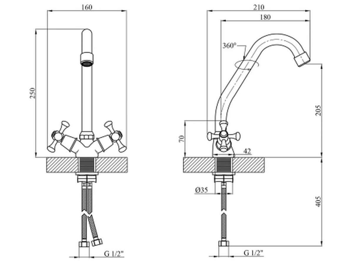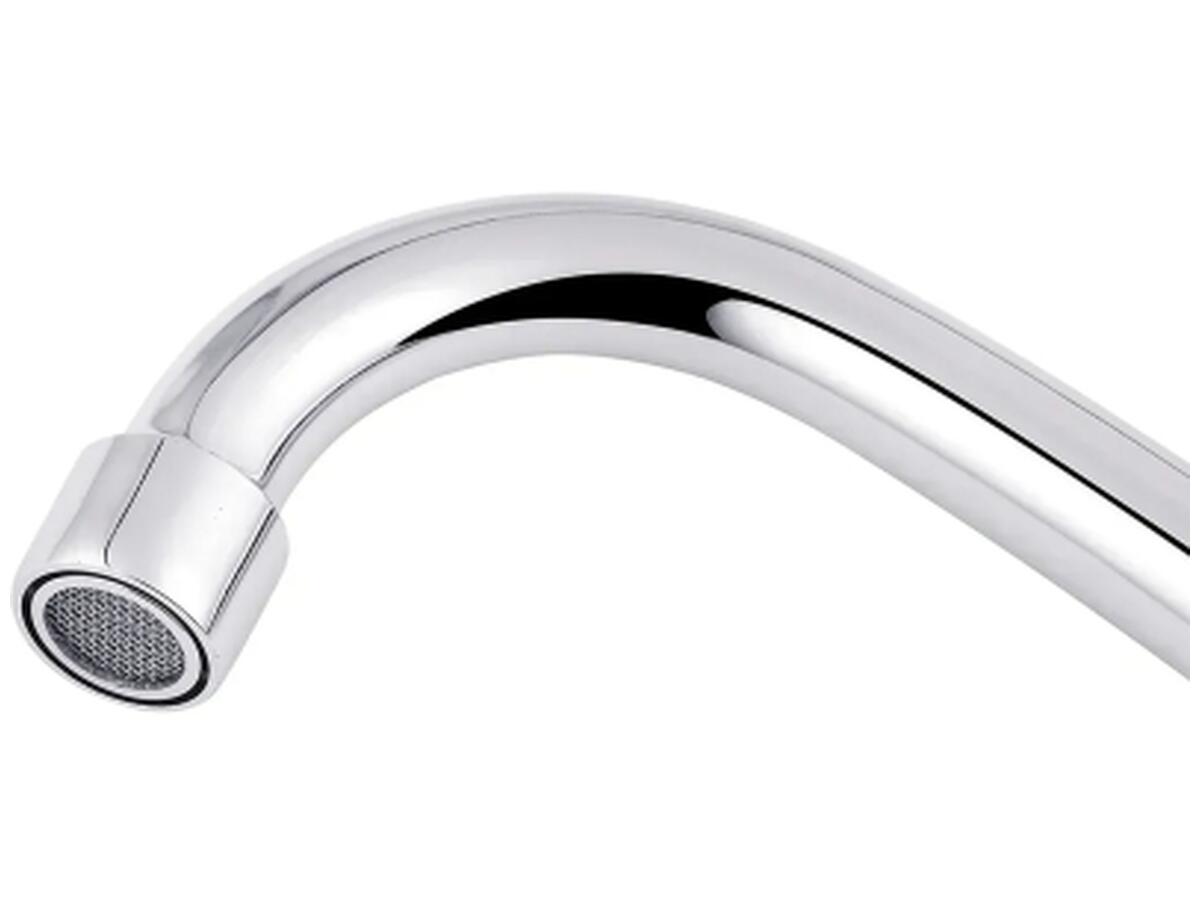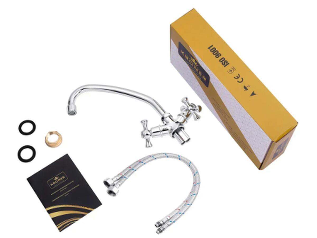 Поворотный излив длиной 16 см с J-образной формой обеспечивает удобство при наполнении крупной посуды, а угол поворота 360° повышает комфорт использования. В конструкции применяется кран-букса, позволяющая плавно регулировать температуру и напор воды. Комплектация содержит все необходимое для установки: шланги подвода воды, крепежи и инструкцию.