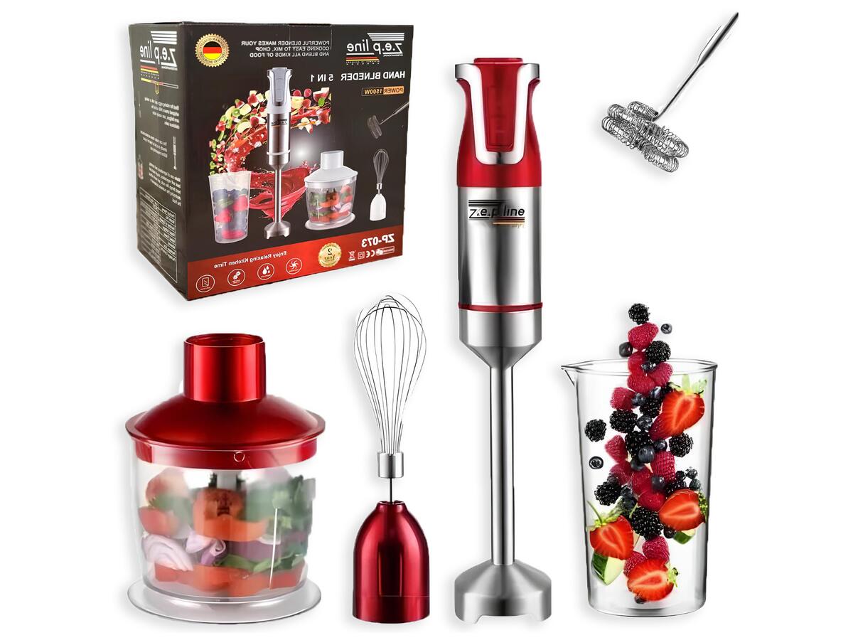 Главное: Погружной блендер Zepline ZP-074 5 в 1 мощностью 1500 Вт — универсальный кухонный прибор, идеальный для быстрого и качественного измельчения, смешивания, взбивания и вспенивания молока. Его нержавеющая металлическая ножка и высококачественные насадки гарантируют долговечность и эффективность.