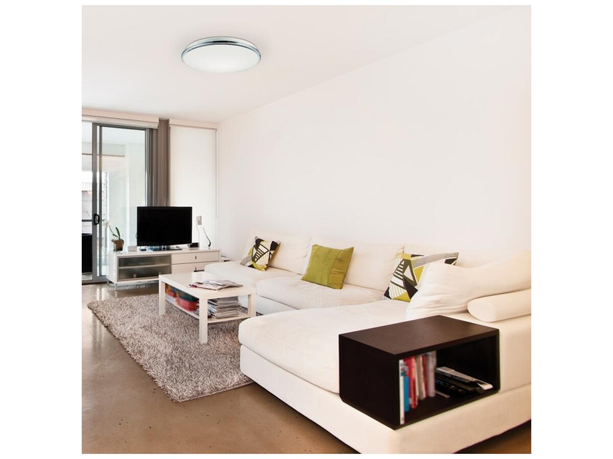 Світильник виконаний з високоякісних матеріалів - металевого корпусу з хромованою обробкою та акрилового плафону білого кольору. Вбудовані світлодіодні лампи забезпечують потужність 18 Вт, створюючи приємне та рівномірне освітлення. Ступінь захисту IP20 дозволяє використовувати світильник у сухих приміщеннях.