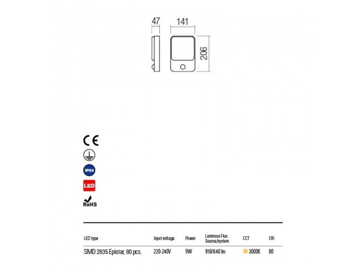 Дополнительное преимущество модели – встроенный датчик движения, который автоматически активирует свет при появлении человека и выключает его при отсутствии движения, что способствует экономии электроэнергии и повышению уровня безопасности. Светильник из коллекции COLIN (REDO) идеально подходит для установки как на частных домах, так и на коммерческих объектах, а гарантия на изделие составляет 12 месяцев.