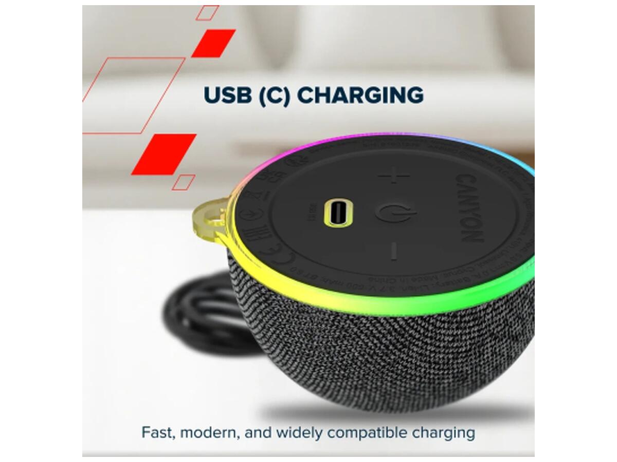 Стабильное беспроводное подключение к смартфонам, планшетам и ноутбукам гарантирует беспрерывное воспроизведение музыки, а встроенный аккумулятор емкостью 600 мА·ч обеспечивает несколько часов работы. Зарядка через современный порт USB-C с кабелем длиной 50 см происходит быстро и удобно.
