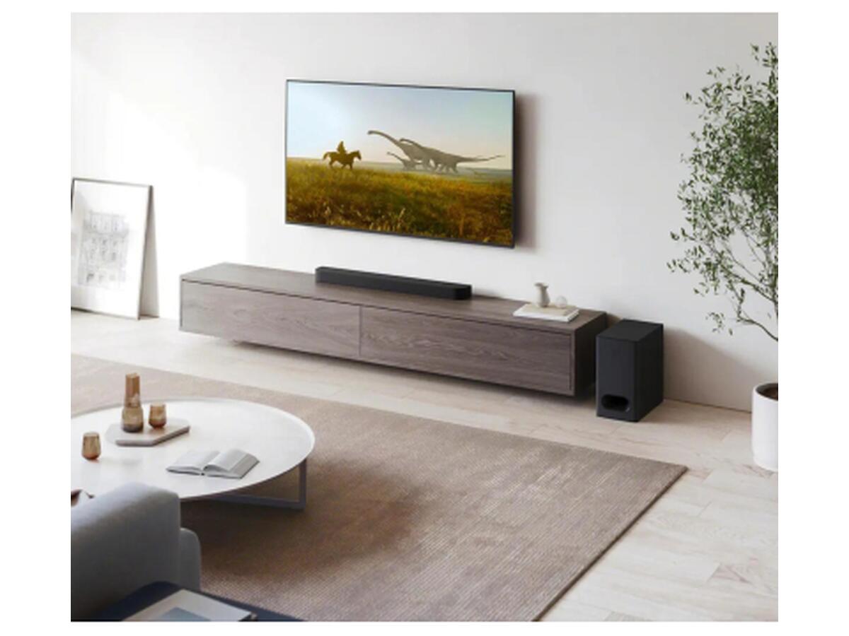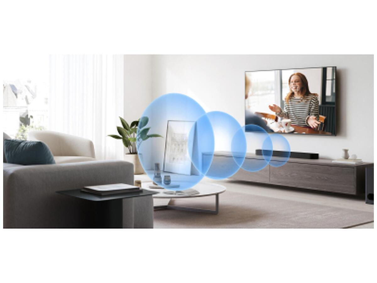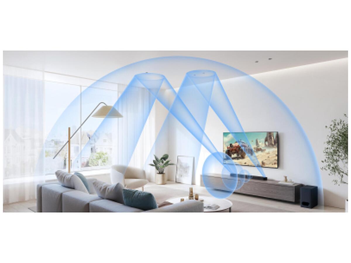 Особенностью модели являются динамики, направленные вверх, создающие пространственное звучание, и беспроводной сабвуфер, который добавляет насыщенный и глубокий бас. Центральный канал гарантирует четкость и разборчивость голосов при просмотре. Технологии S-Force PRO и Vertical Surround Engine обеспечивают эффект полного погружения в аудио атмосферу.