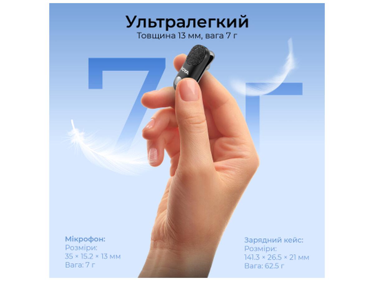 - Петличный микрофон: Чрезвычайно легкий (только 7 г) и компактный. Идеально подходит для интервью, видеоблога или потоковой речи, оставаясь незаметной и не отвлекая внимание от кадра.