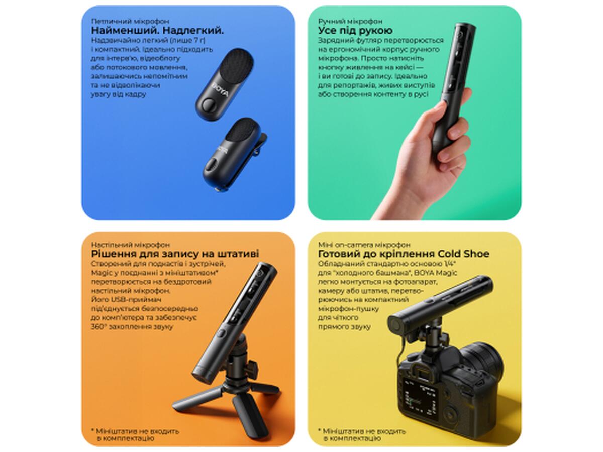 Зарядный кейс превращается в эргономичный ручной микрофон одним нажатием кнопки. Для подкастов и видеозвонков BOYA Magic можно использовать как настольный микрофон, подключив USB-приёмник к компьютеру. Благодаря стандартному креплению 1/4" устройство легко устанавливается на камеру или штатив и работает как компактный направленный микрофон.