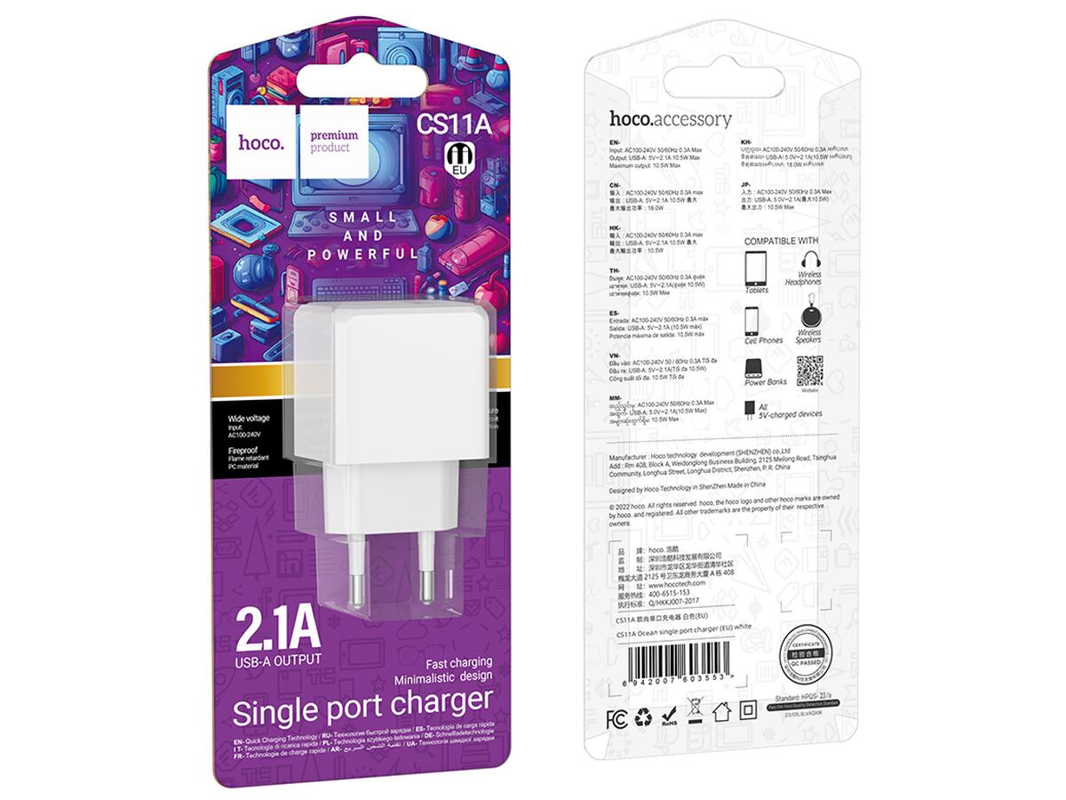 Это компактное и удобное в использовании сетевое зарядное устройство от HOCO совмещает в себе эффективность и безопасность. Зарядное устройство оснащено одним USB Type-A портом, обеспечивающим стабильную подачу питания с выходным напряжением 5 В.