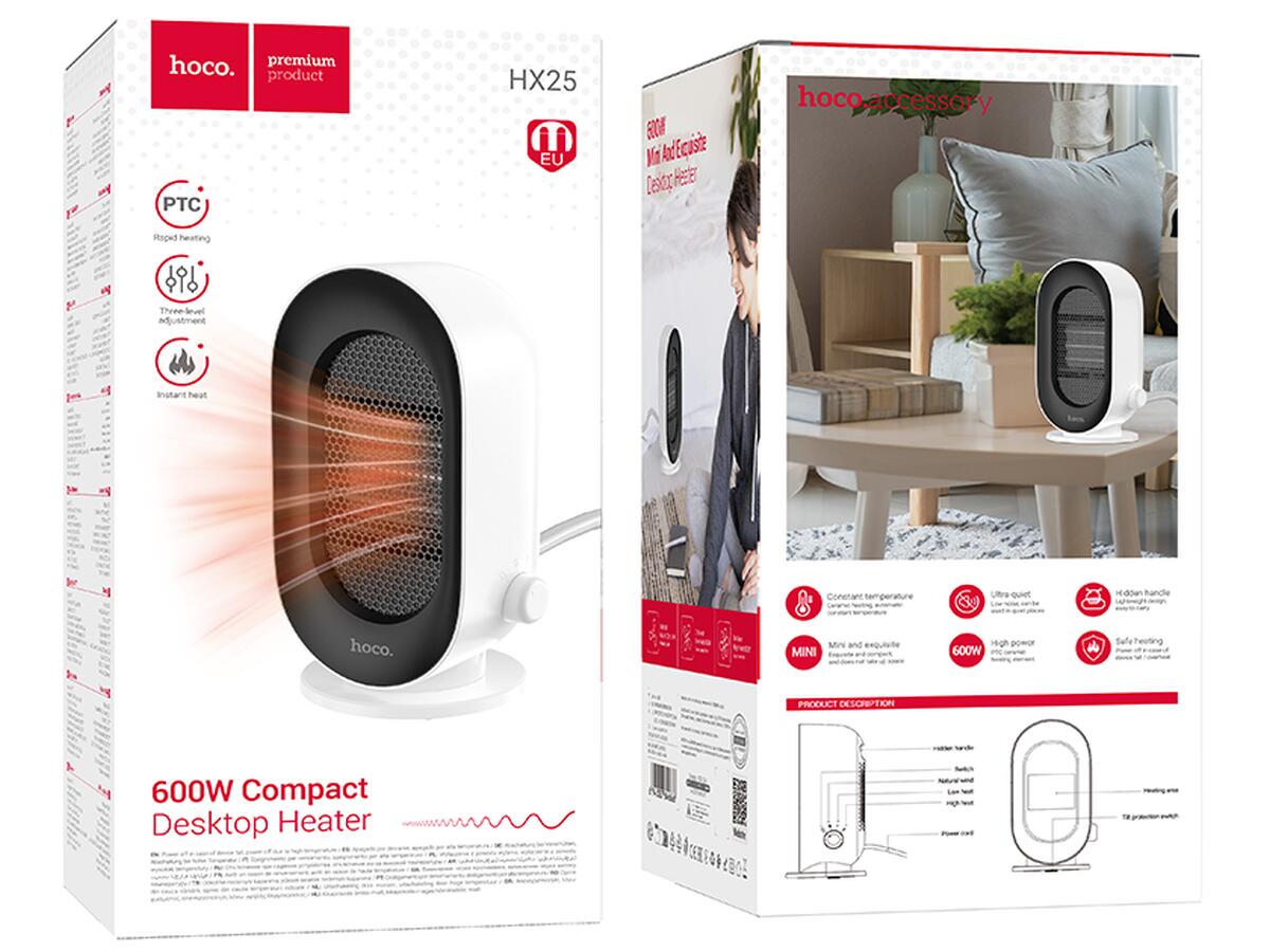 Модель Hoco HX25 с мощностью 600 Вт превосходно справляется с быстром обогревом любых помещений. Благодаря современному керамическому PTC-элементу, устройство эффективно преобразует электроэнергию в тепло.