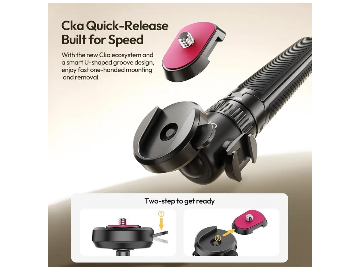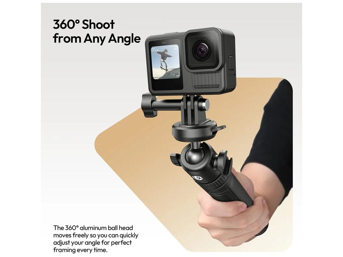 Система быстрой фиксации оборудования с U-образным пазом поддерживает крепления как с резьбой 1/4", так и совместимы с GoPro, что упрощает установку камер и гаджетов. Алюминиевый шарнирный механизм с полноценным вращением на 360 градусов помогает максимально точно настроить угол съемки.