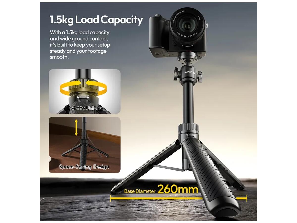 Несмотря на свой малый вес всего 189 грамм, штатив обладает высокой устойчивостью благодаря надежному основанию с резиновыми накладками и широкой базой в 26 см. Он способен выдерживать нагрузку до 1.5 кг, что подходит для большинства мобильных камер и аксессуаров. Дополнительно предусмотрен холодный башмак с возможностью вращения, который можно использовать для крепления дополнительного оборудования — микрофонов или осветительных приборов.