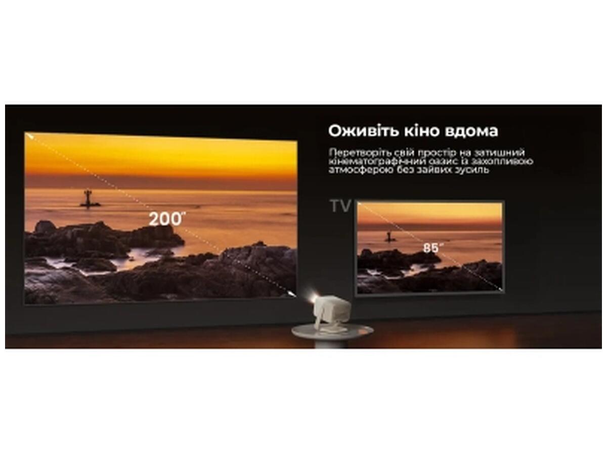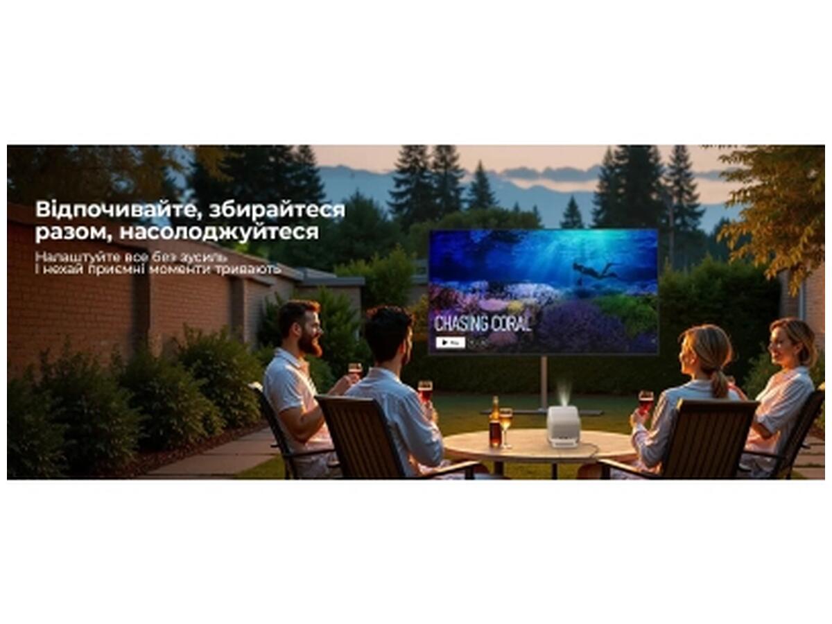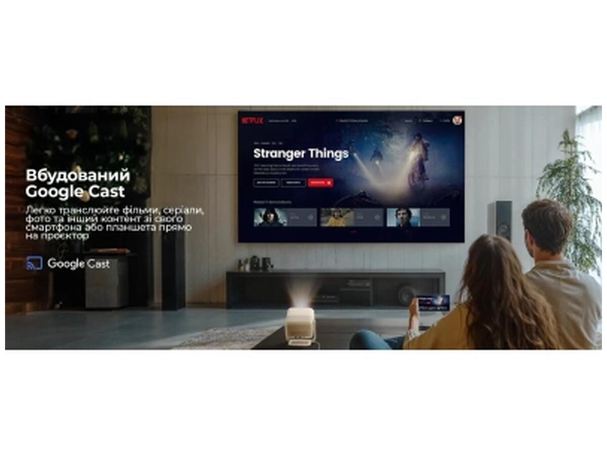 Лаконичный корпус в бежевом цвете органично вписывается в любой интерьер. Устройство легко переносить — вес всего 1.8 кг. Простое управление, реализованное через пульт и разнообразные порты подключения (HDMI, USB Type-C и другие), позволяет быстро интегрировать проектор с мультимедийными устройствами. Низкий уровень шума обеспечивает комфортный просмотр без отвлекающих звуков.