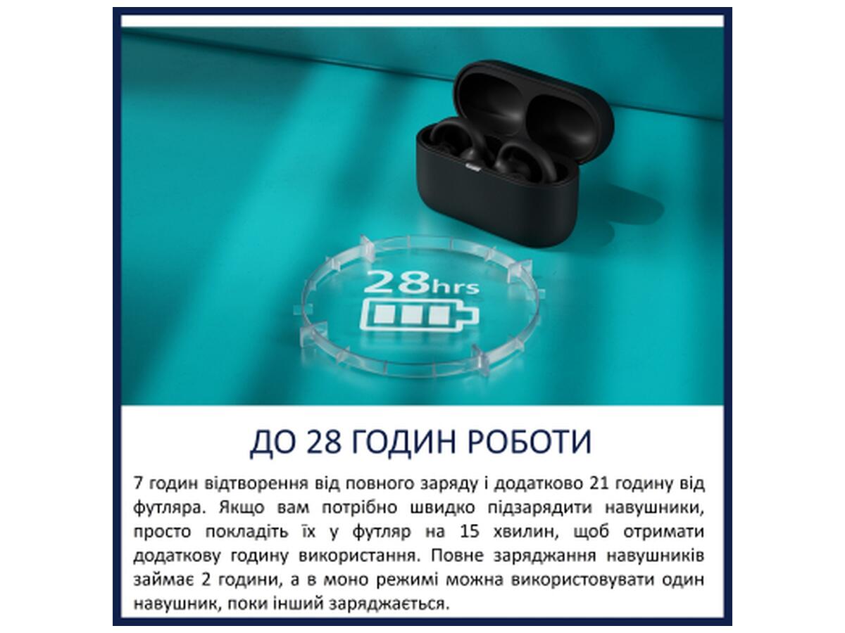 Наушники обеспечивают до 7 часов воспроизведения без подзарядки. Компактный футляр продлевает общее время работы до 28 часов. Быстрая зарядка за 15 минут подарит дополнительный час прослушивания, а полный цикл зарядки занимает всего 2 часа. Кроме того, возможна работа в монофоническом режиме, позволяющем использовать один наушник во время зарядки другого.
