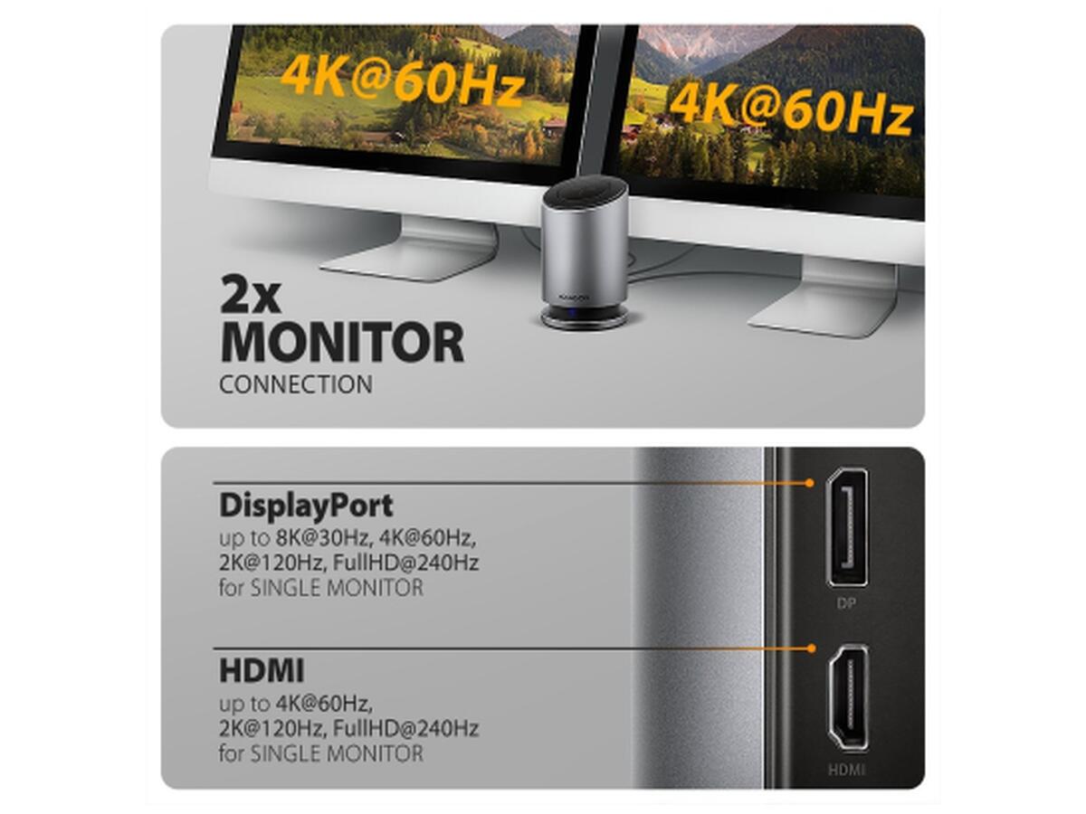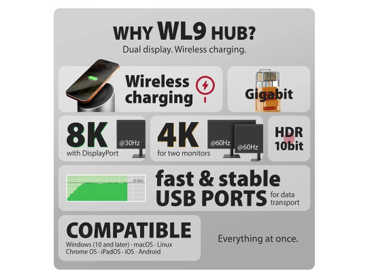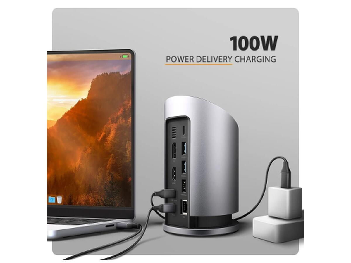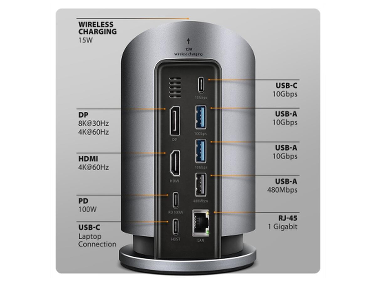 Этот универсальный USB-C хаб от AXAGON объединяет в себе множество портов и функций, обеспечивая удобное расширение возможностей вашего ноутбука или другого устройства с USB Type-C. Он оснащён разъемами RJ45 для подключения к проводной сети, несколькими USB-портами для периферии, HDMI и DisplayPort для вывода изображения, а также поддержкой быстрой зарядки с мощностью до 100 Вт и дополнительной беспроводной зарядкой 15 Вт.