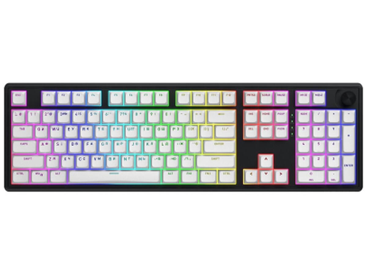 Клавиатура поддерживает три режима подключения: проводной, Bluetooth и беспроводной 2.4 ГГц, обеспечивая совместимость с различными устройствами. Эргономичные Double-shot ABS кейкапы отличаются высокой прочностью и приятной текстурой. RGB-подсветка с палитрой 16.8 миллионов цветов позволяет индивидуально настраивать подсветку каждой клавиши. Боковые панели с 19 зонами подсветки могут синхронизироваться с основной подсветкой или настраиваться отдельно через программное обеспечение. Поддержка полного N-Key Rollover гарантирует точную регистрацию всех нажатий даже во время динамичного игрового процесса. Фирменное программное обеспечение открывает широкие возможности кастомизации клавиатуры под индивидуальные потребности пользователя.